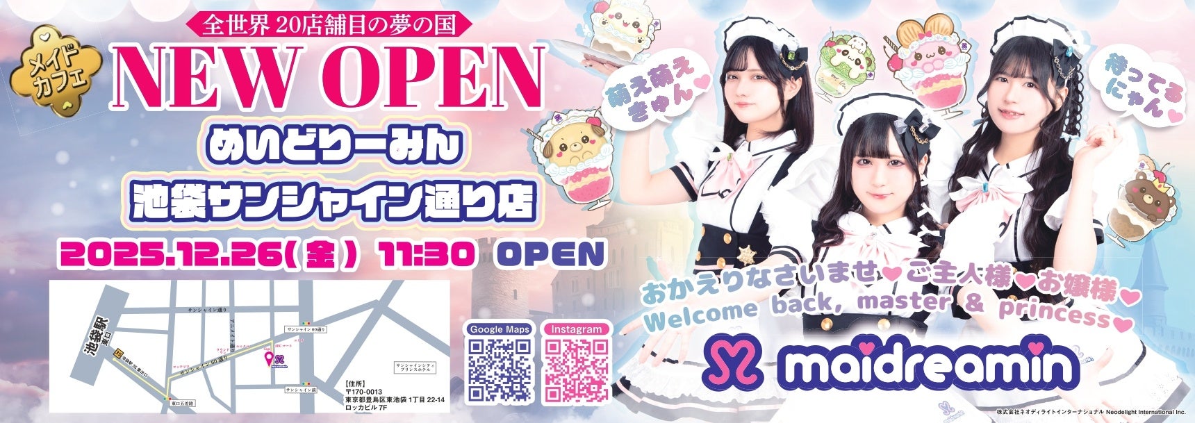 株式会社ネオディライトインターナショナル(本社:東京都千代⽥区、代表取締役社⻑:鈴⽊雄⼀郎)は2025年12月26日(金)、『めいどりーみん池袋サンシャイン通り店』をオープンいたします。