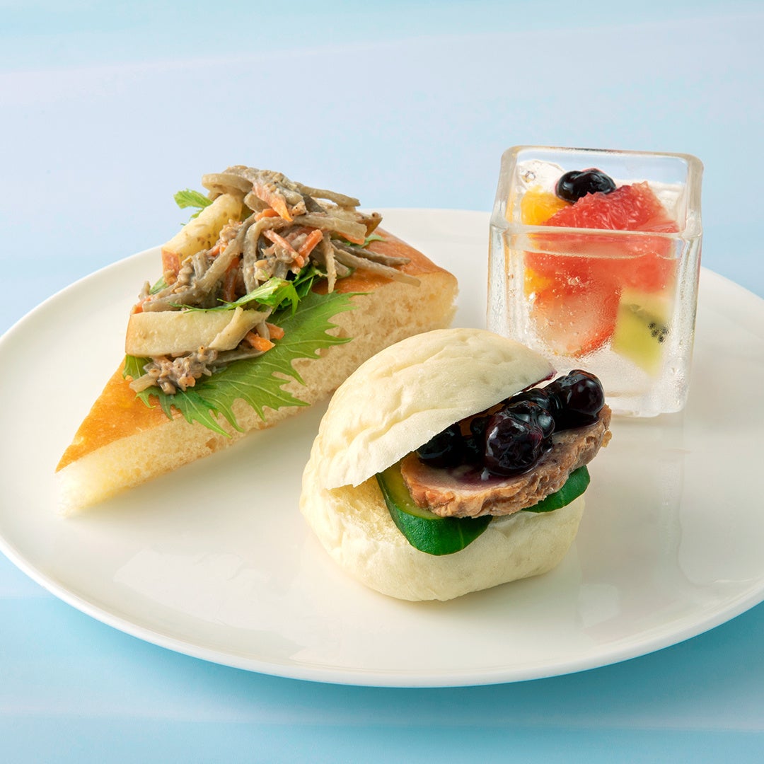ローストポークとミックスベリーのサンドウィッチ/ごぼうとりんごのオープンサンドウィッチ/フルーツとゼリーのキューブグラス