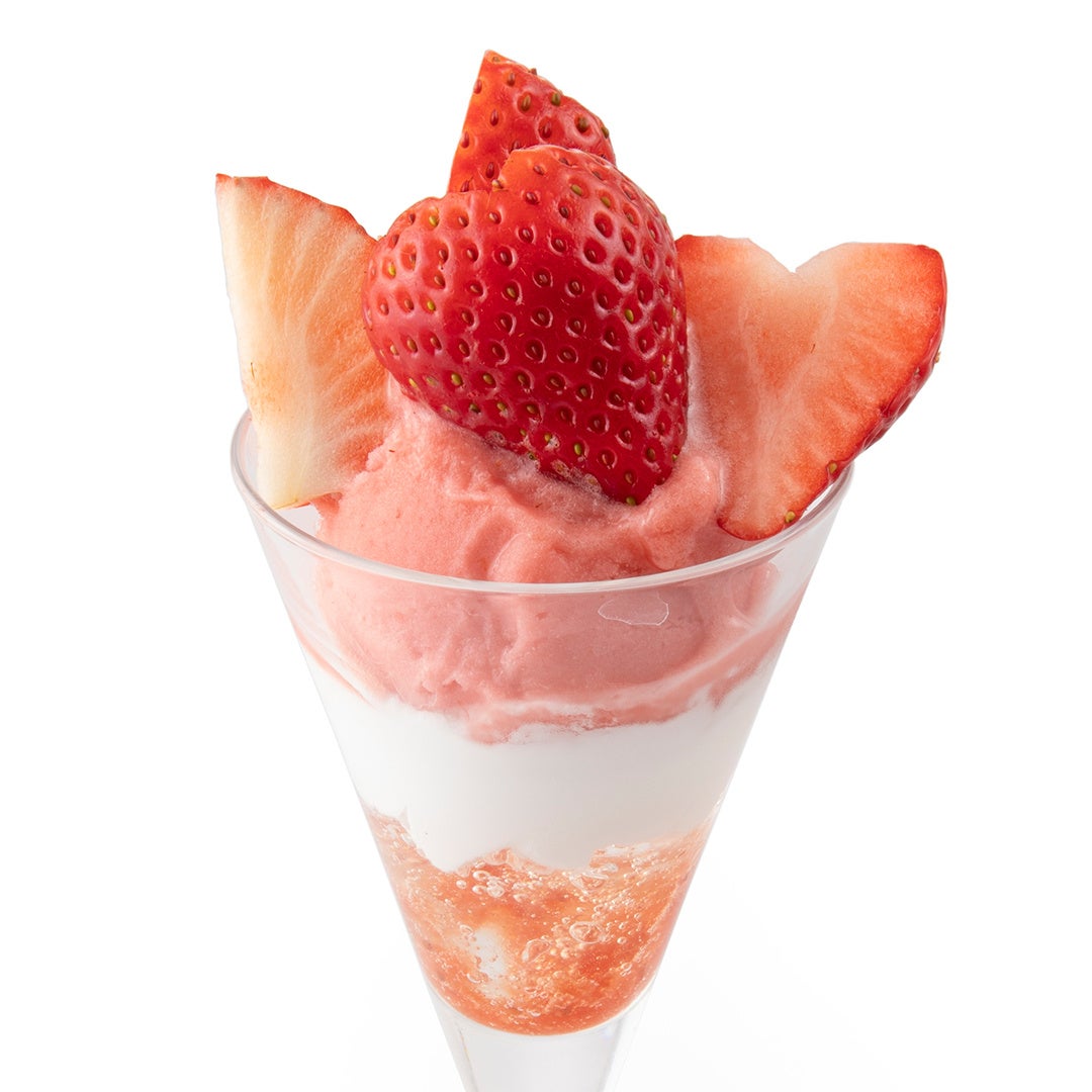 苺の香りと甘酸っぱさをしっかりと感じられる店内製造シャーベットと、苺ソース、ディプロマットクリームを重ねたパフェです。