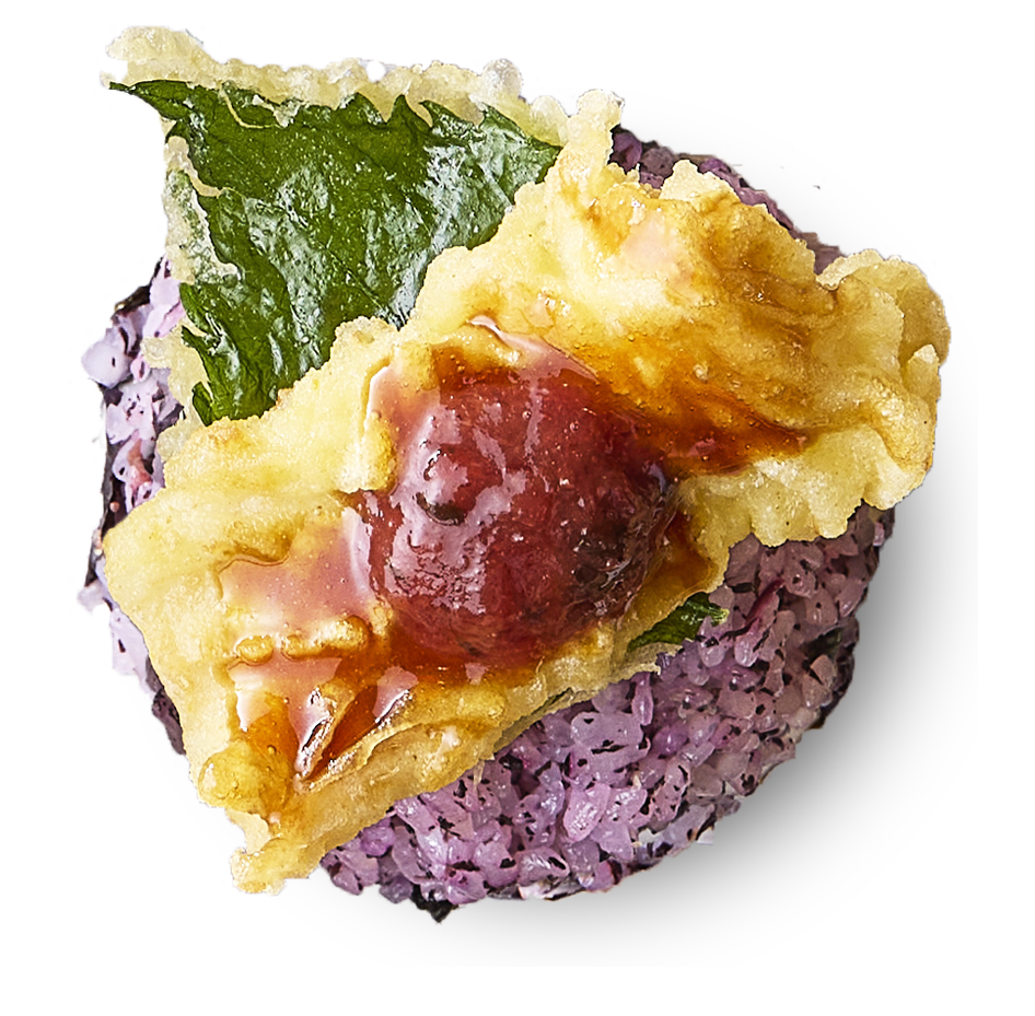 赤シソごはんに大葉天、梅かつおを組み合わせることで、清涼感のある味わいに。仕上げの梅かつおがほんのり甘酸っぱさを添えます。さっぱりとした味わいで、もう一個にぴったりなおむすび。