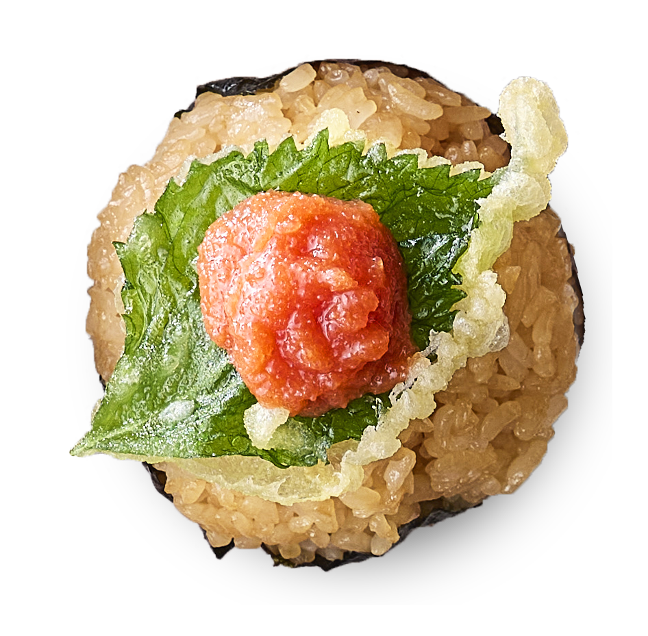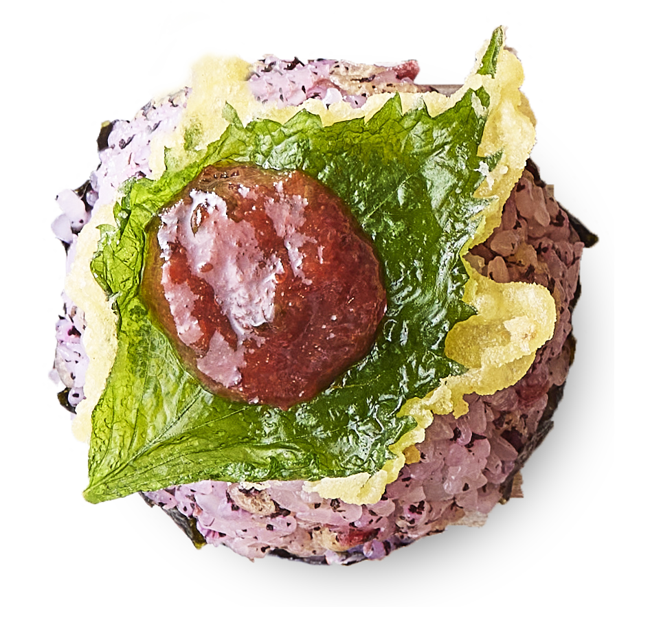 赤シソごはんにイカ天、そして大葉天と梅かつおが加わり、和の風味が広がるおむすびです。