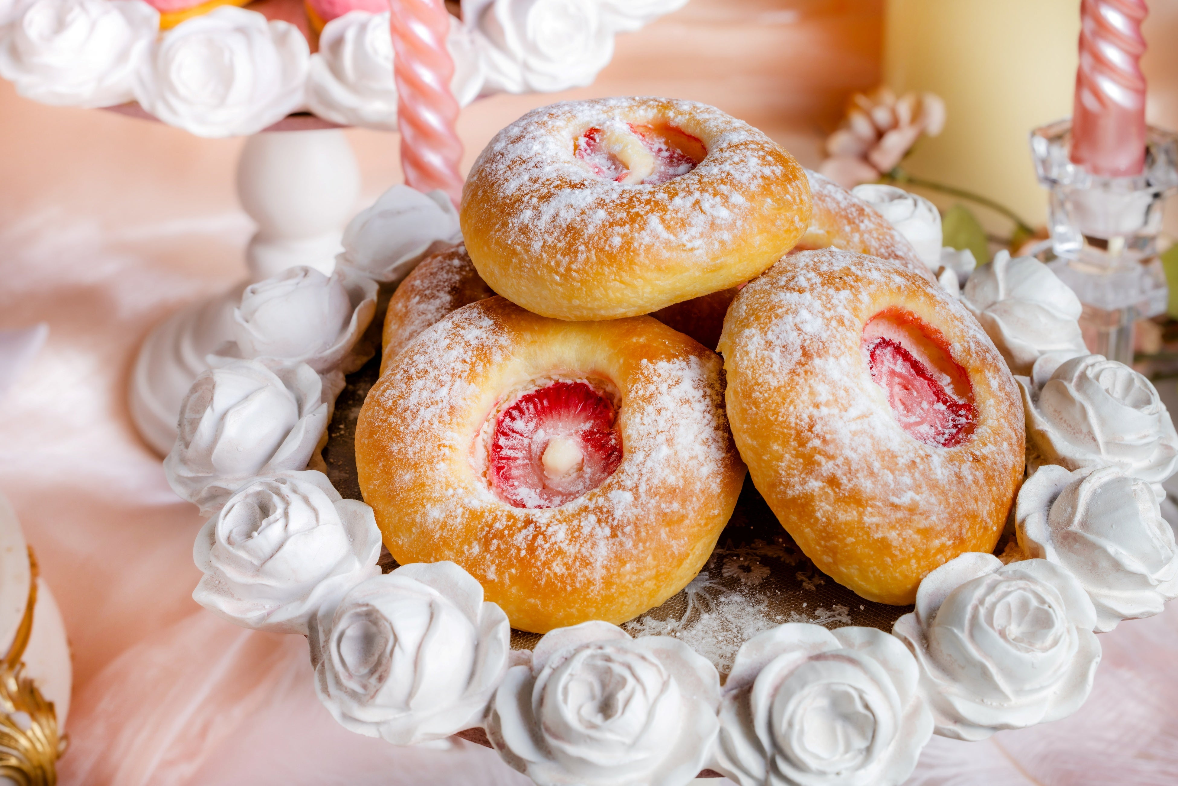 バターの芳醇な香りが漂うパン生地に、あっさりとしたクリームチーズ、いちごジャム、フレッシュいちごを乗せたパン系スイーツです。