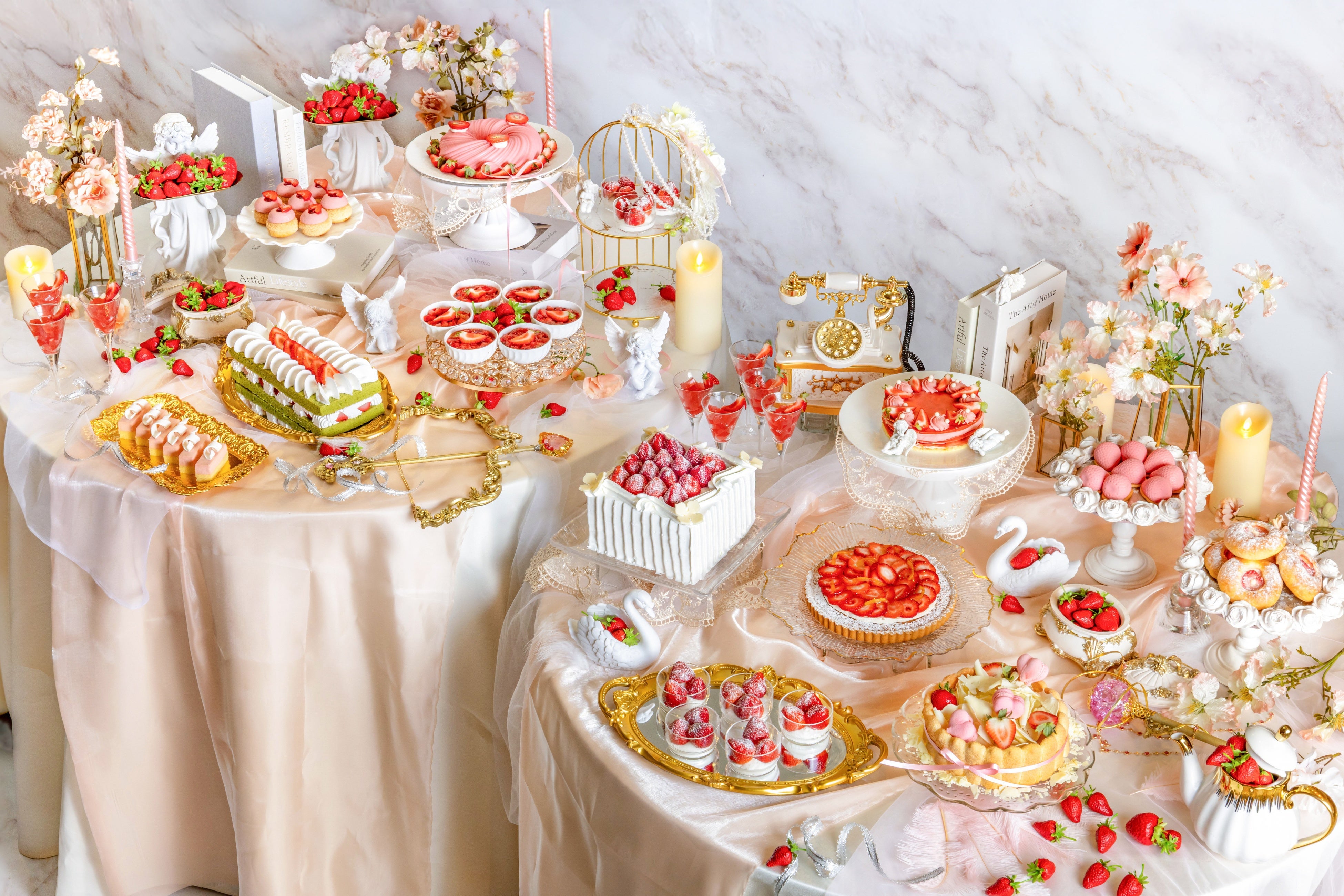 毎年好評のヒルトン福岡シーホークのいちごのスイーツビュッフェ。今年のテーマは、近年Z世代を中心に流行中の、天使をモチーフにした幻想的で可憐な世界観を取り入れたスタイル「エンジェルコア」。“いちごに恋をした天使たちが、いちごの美味しさ・美しさに陶酔していく物語“を、いちごをたっぷりと使用したスイーツと天使や羽をモチーフにした装飾で表現しました。