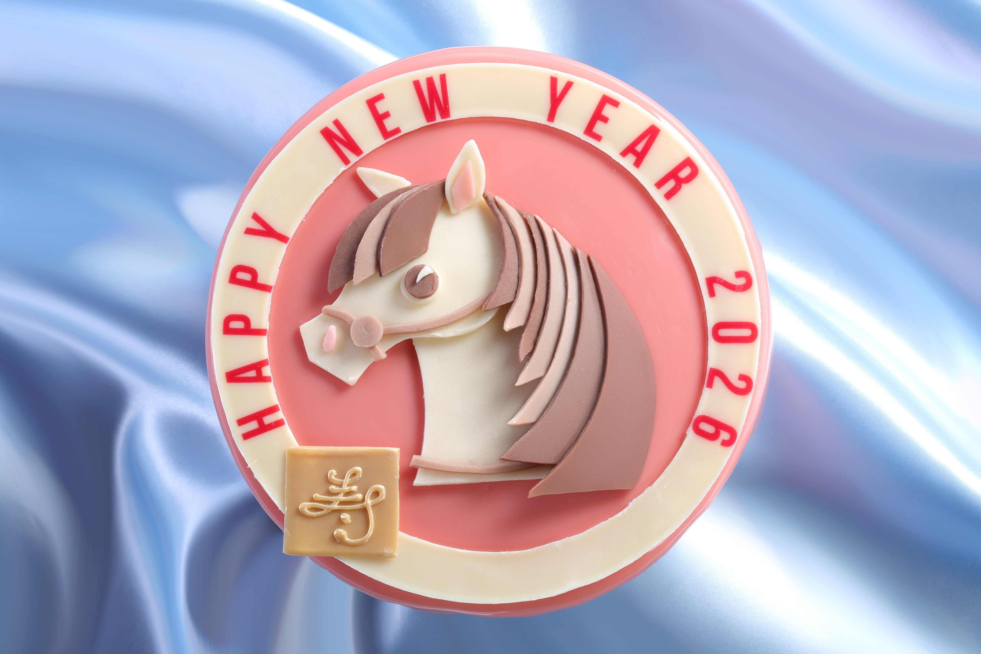 「干支スイーツ ~午~」は、チョコレートで白馬を表現した、メルヘンチックなパステルピンクのムースケーキです。ライチのムースとジュレを甘酸っぱいいちごのムースで包み込み、さっぱりとした味わいに仕上げています。ご家族やご親戚が集まる新年の食卓に、お正月の手土産におすすめのスイーツです。