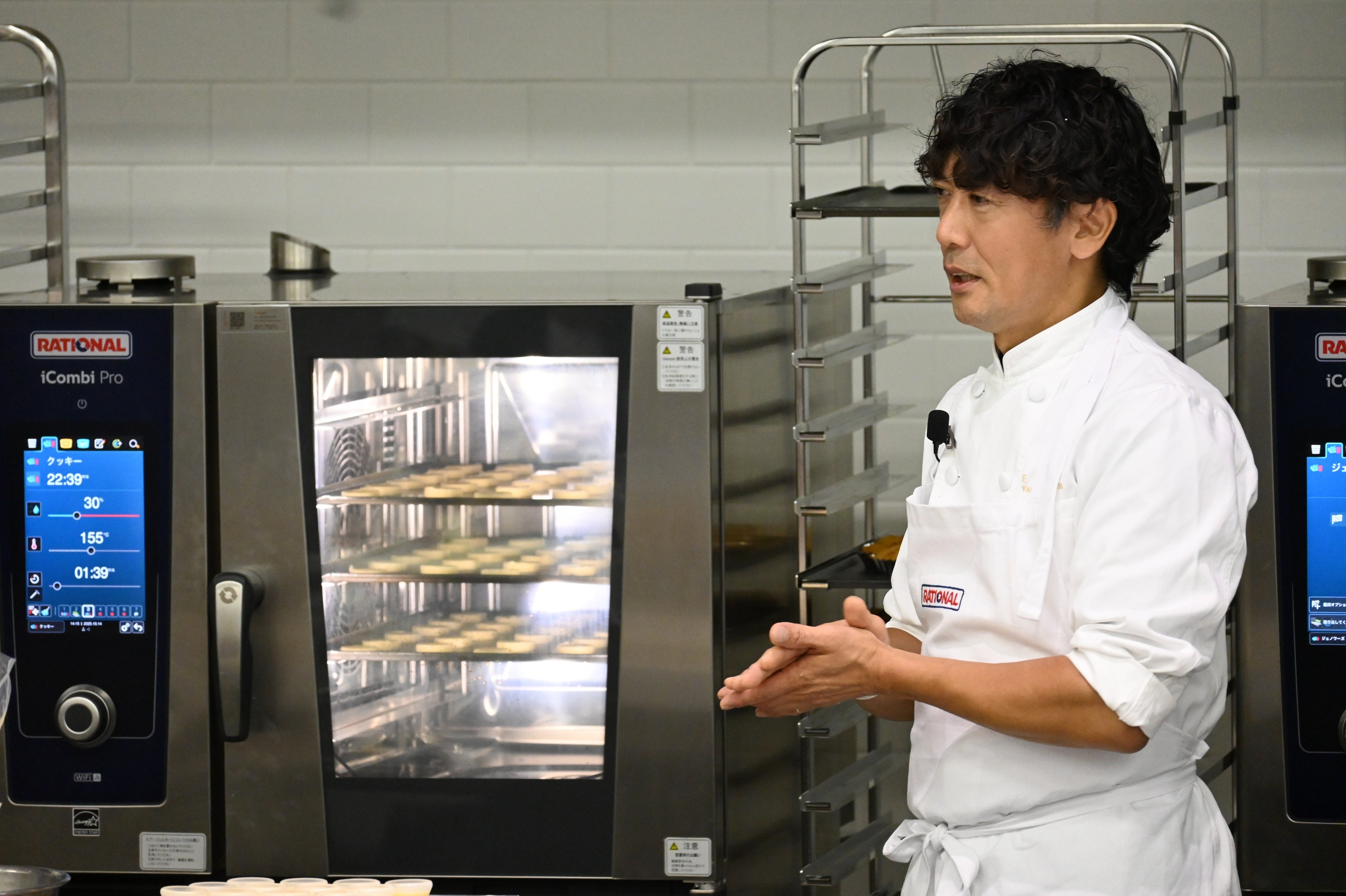 兼ねてよりRATIONALのイベントに講師として参加している髙木シェフは、今回のイベントで「前回のExpert Kitchenが2025年2月に発行された著書「洋菓子の新焼成法」(旭屋出版 発行)のきっかけとなった」と語り、スチームコンベクションオーブン「iCombi Pro」で、蒸気を入れてアイテムを焼成する中で確立した独自の理論を紹介できればと冒頭であいさつしました。約3時間のイベントでは、実際に販売しているアイテムを含む8品の実演を行いました。