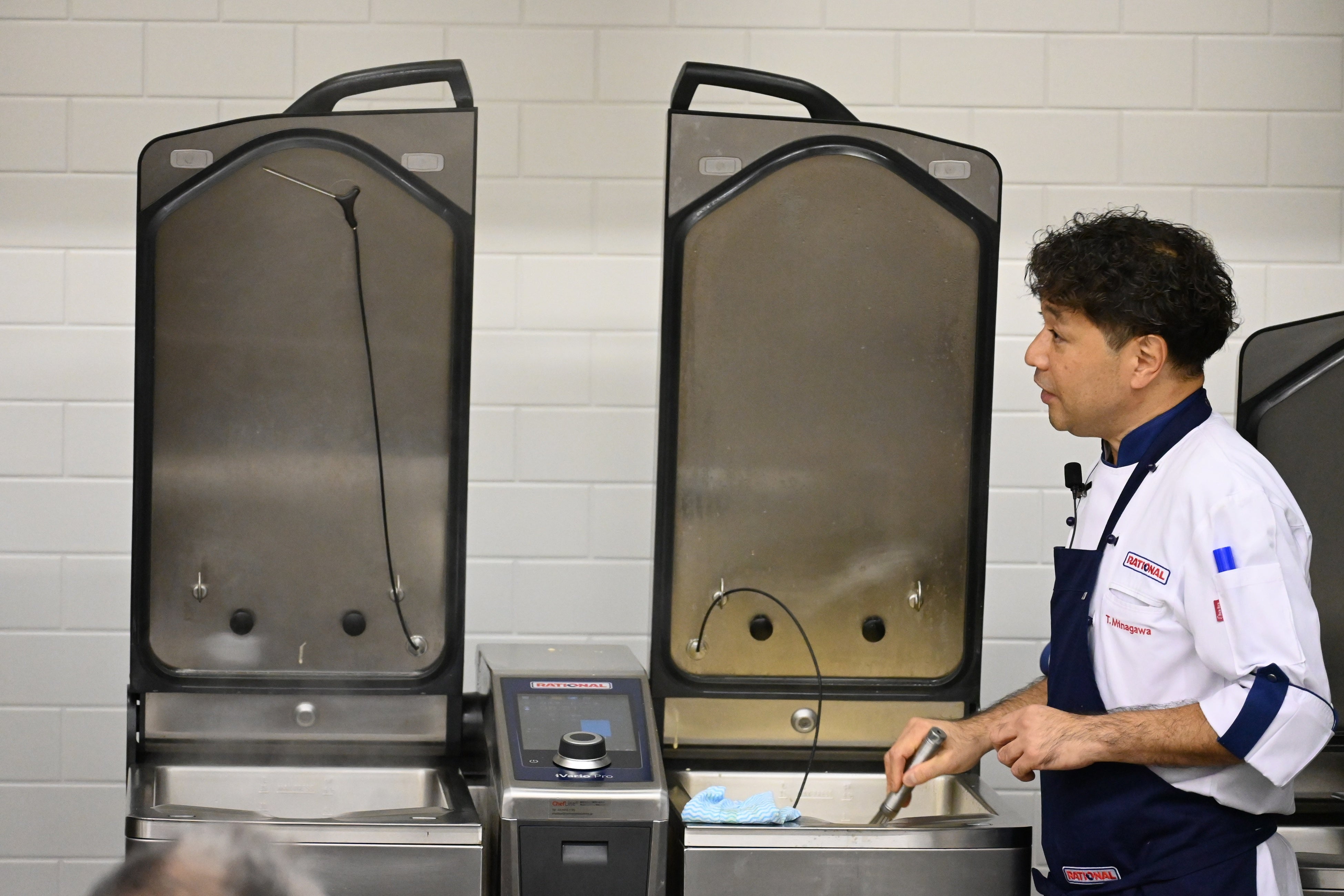 イベントの中盤では、ラショナル・ジャパンのコーポレートシェフ皆川忠康から、多機能調理器「iVario Pro」を紹介しました。1台で煮る、焼く、炒める、揚げる、圧力調理もこなす同機ですが、イベントでは製菓の現場でも特に注目される餡子とカスタードクリームを実演。従来は鍋に火をかけて常に火加減を確認したり攪拌が必要であった作業が、iVario Proでは繊細な温度コントロールで制御可能、手間や時間をかけずとも品質の高い仕上がりを実現できることを伝えました。