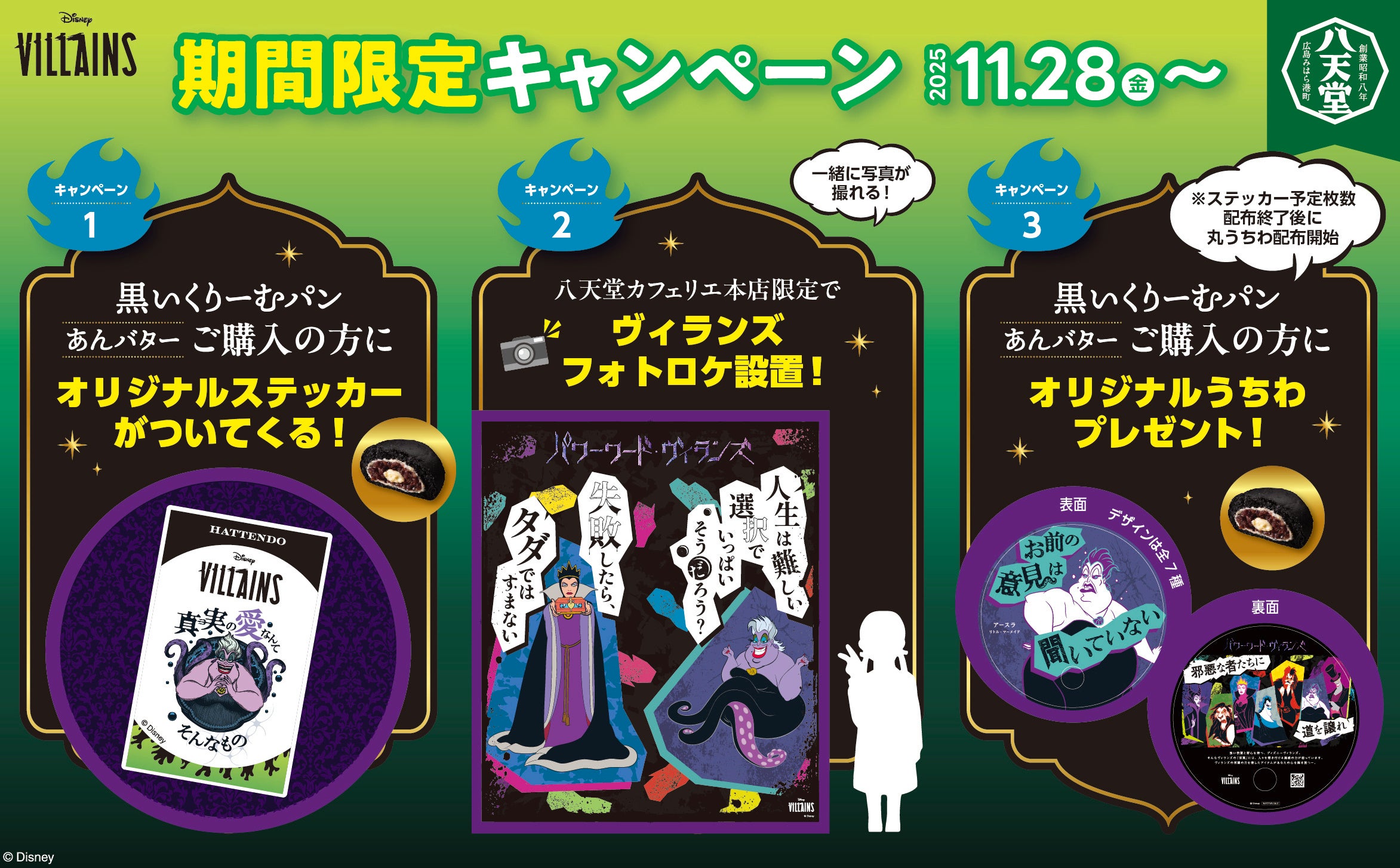 株式会社八天堂(本社:広島県三原市、代表取締役:森光孝雅)は、株式会社ウォルト・ディズニー・ジャパン(本社:東京都港区、代表取締役社長:日色保)が企画する『パワーワード・ヴィランズ』キャンペーンに参画しています。2025年11月28日(金)より、『ディズニーヴィランズ』デザインの「黒いくりーむパン あんバター」を全国の八天堂店舗(一部店舗を除く)で順次発売します。(11月28日(金)~千葉県・大阪府・広島県の八天堂店舗、12月1日(月)~東京都・静岡県・愛知県・大分県の八天堂店舗)