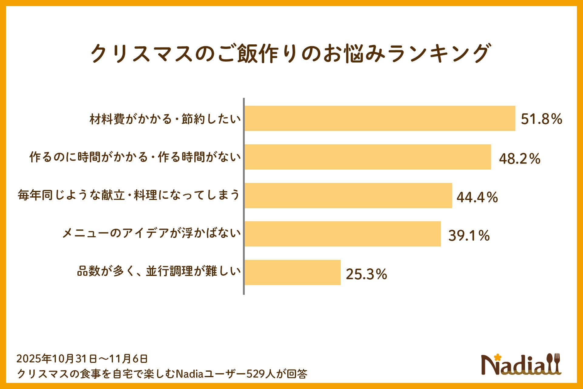 クリスマスのご飯作りのお悩みは「材料費がかかる、節約したい」が半数以上