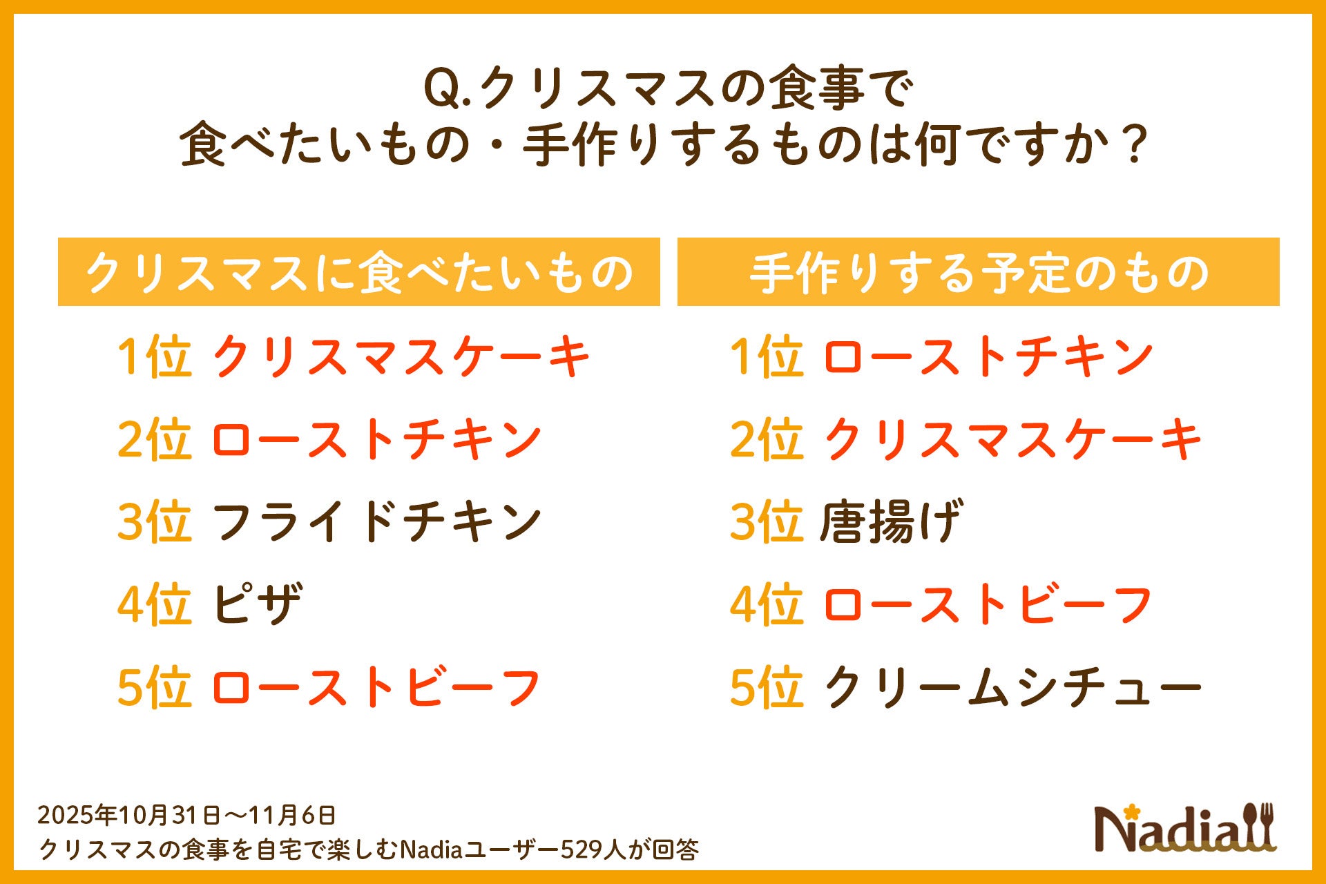 (※)<アンケート調査概要>調査期間および回答者数:2025年10月31日~11月6日 580人(質問によって変動)/調査機関:自社調査/調査対象:クリスマスにイベントご飯を楽しむ、Nadiaに登録しているユーザー/調査方法:メールマガジンにてアンケート回答を募集