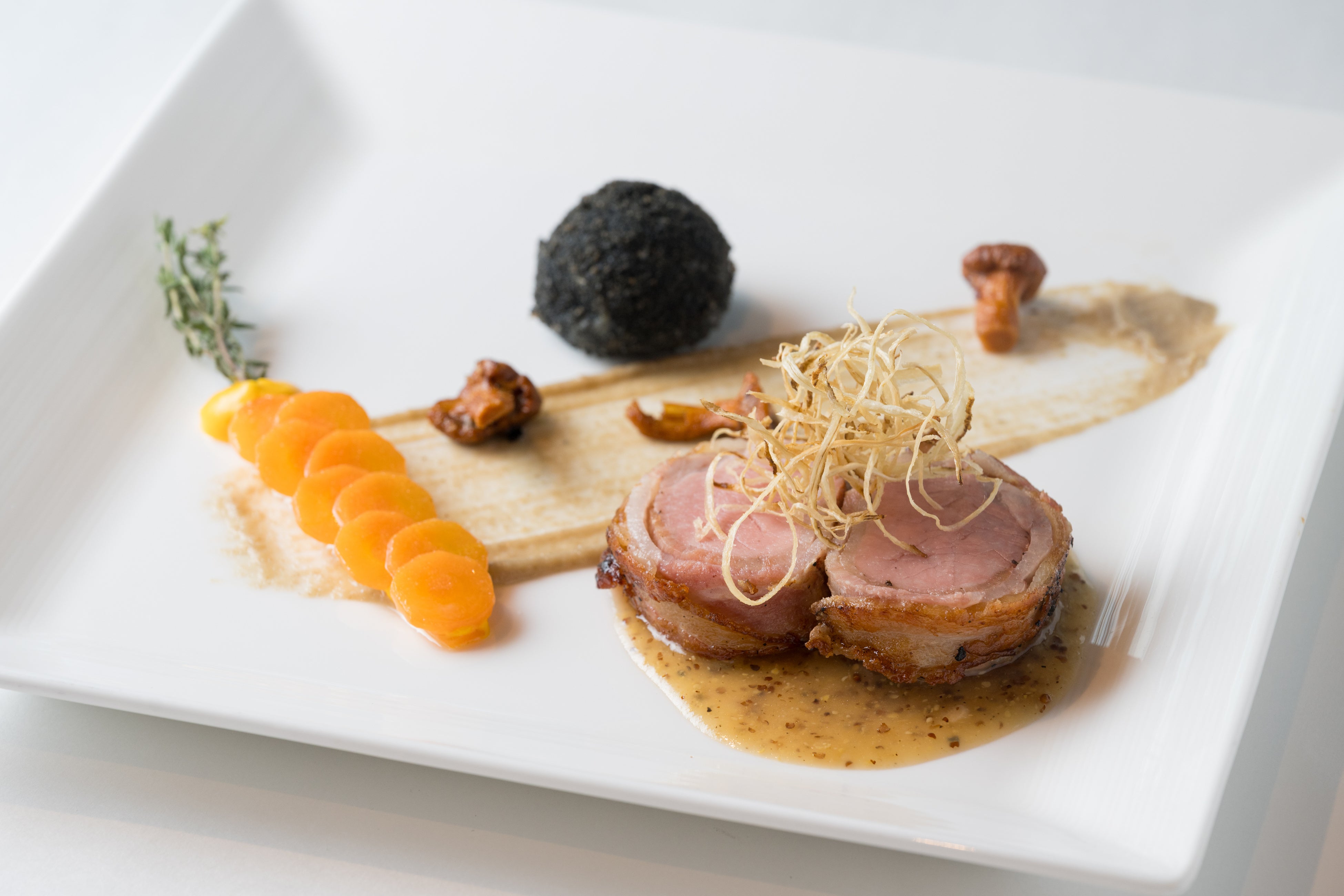 ベーコンで巻いたヒレ肉を、低温でやわらかく火入れし、仕上げに香ばしく焼き上げ、しっとりとした肉質とベーコンの香ばしさを楽しむ一品。白ワインやタイムの香る粒マスタードソースが、肉の旨みを引き立てます。姫人参やゴボウのピューレ、トリュフ風味クロケット、ジロール茸のソテーなど、香り豊かな付け合わせを添えて。素材それぞれの甘みと香ばしさが調和する、奥行きある一皿です。