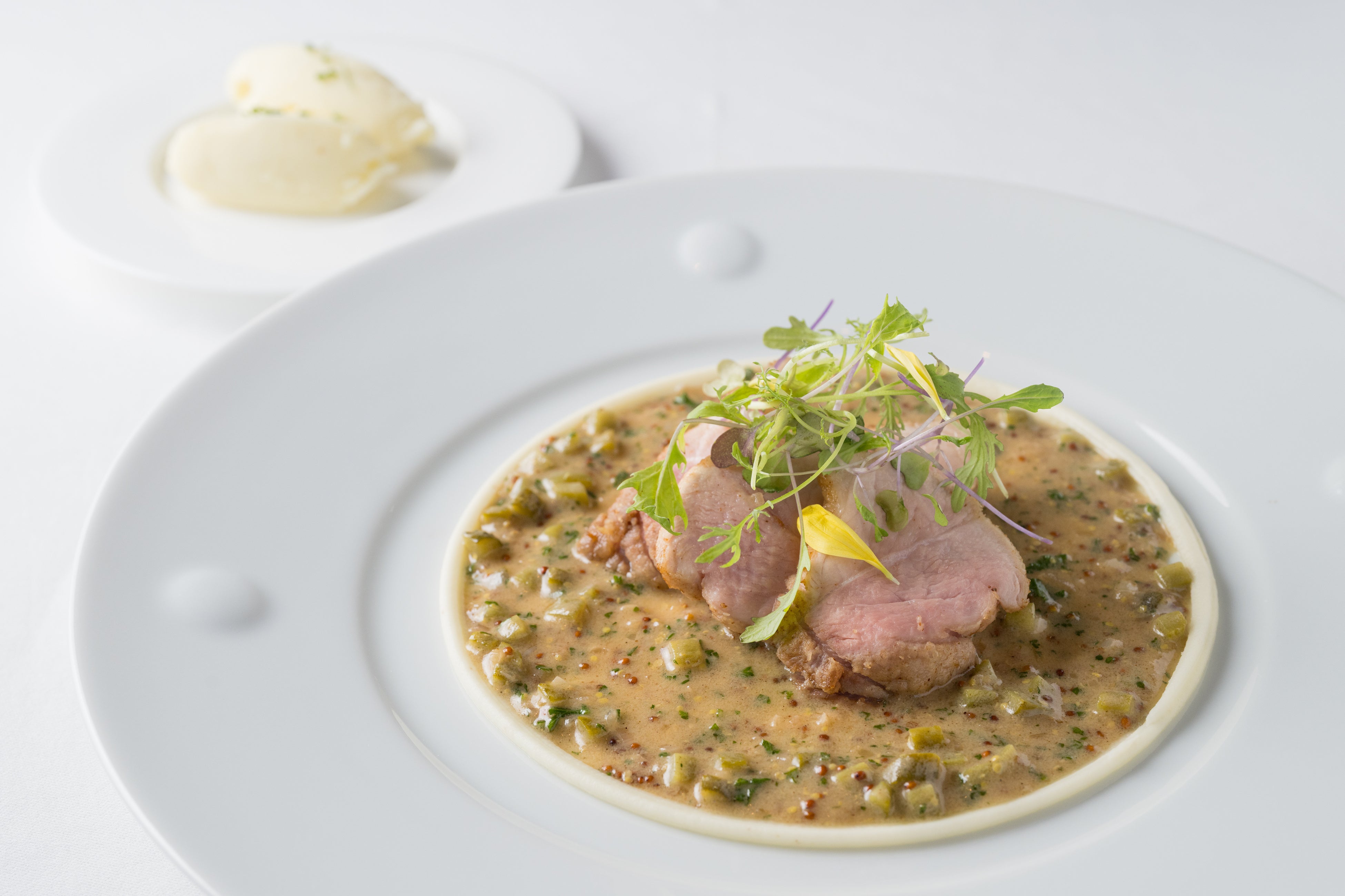 「常陸の輝き」のモモ肉をやわらかくローストし、赤身の旨みと脂の甘みを引き出した一皿。しっとりとしたモモ肉には、ポール・ボキューズの伝統的なシュープレームソースをベースに、ピクルスとエシャロットの爽やかな酸味を効かせたソースを合わせました。まろやかなコクと軽やかな酸味が肉の旨みと口の中で溶け合い、深みのある味わいを生み出します。