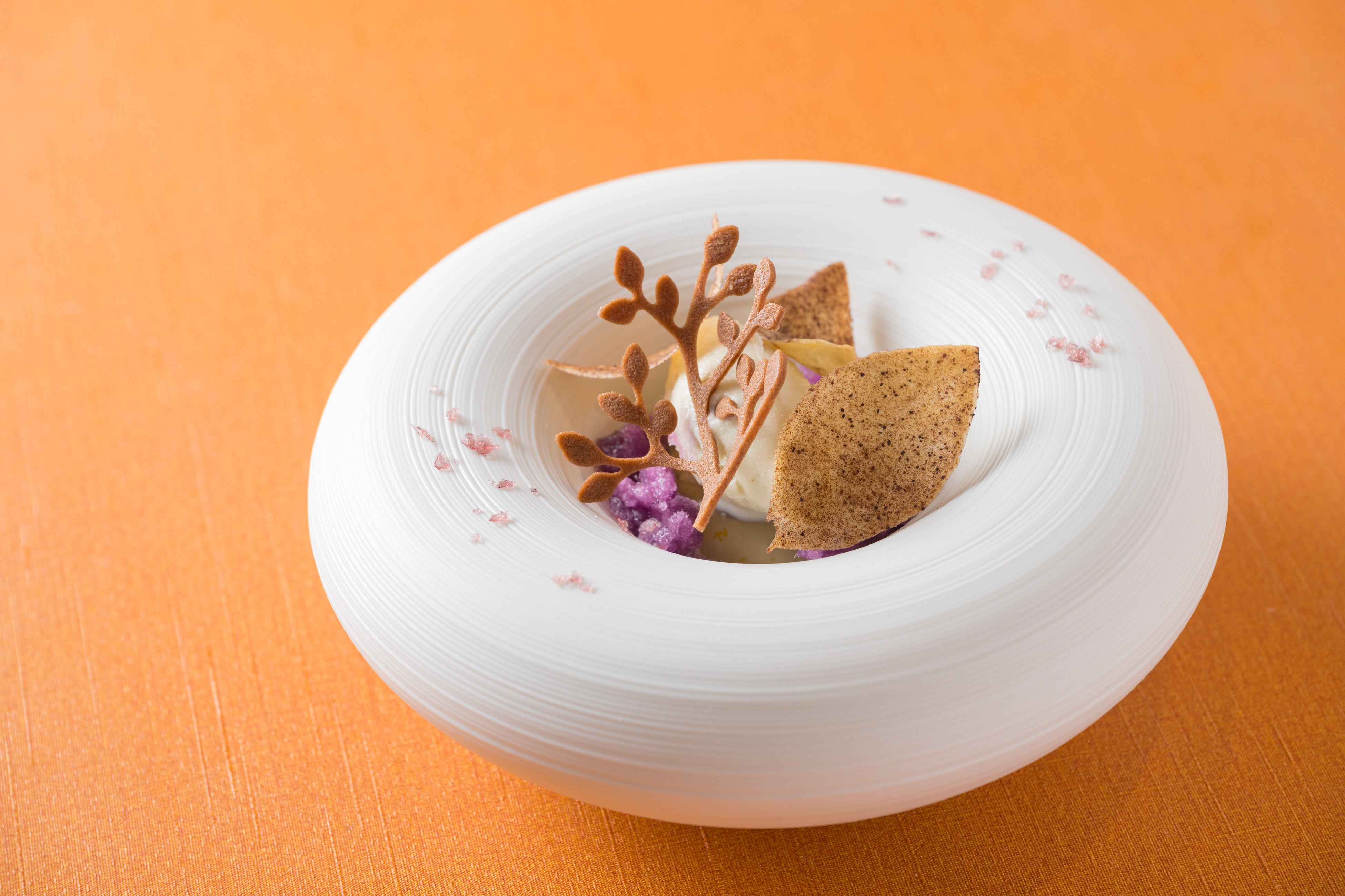 周囲には、ナスのコンポートから抽出したシロップで仕立てたグラニテをあしらい、葉の形の栗ペーストチュイルと、カカオで表現した枝葉を添えて。和と洋、まろやかさと爽やかさが調和した、秋の恵みを感じる贅沢な一品です。