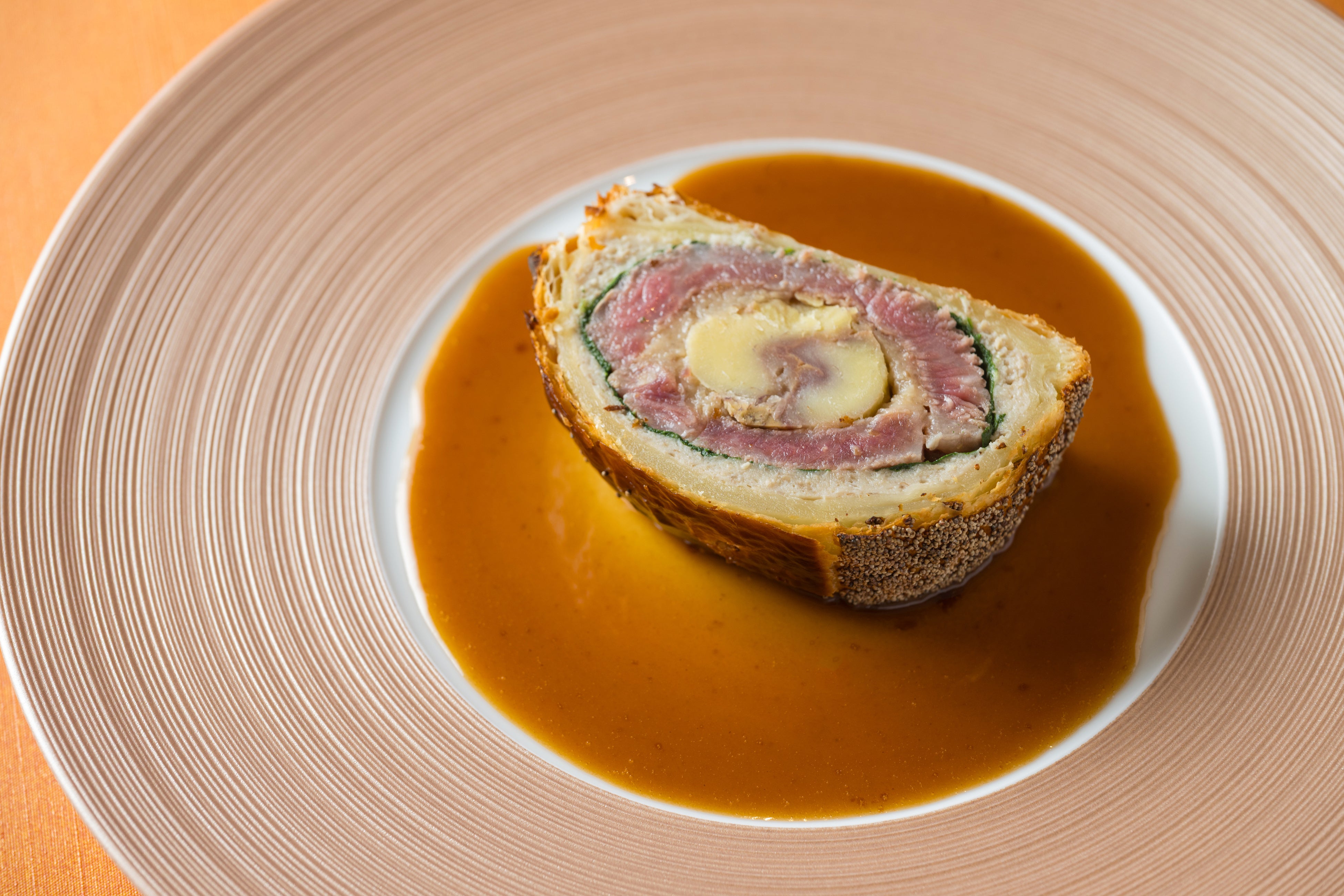 肉厚で柔らかく、とろけるような食感が魅力の「常陸牛 煌」のサーロインを主役に、茨城県産の栗・ほうれん草・鶏肉とキノコの旨みを閉じ込めたつなぎを、香ばしいパイ生地で包み込みました。