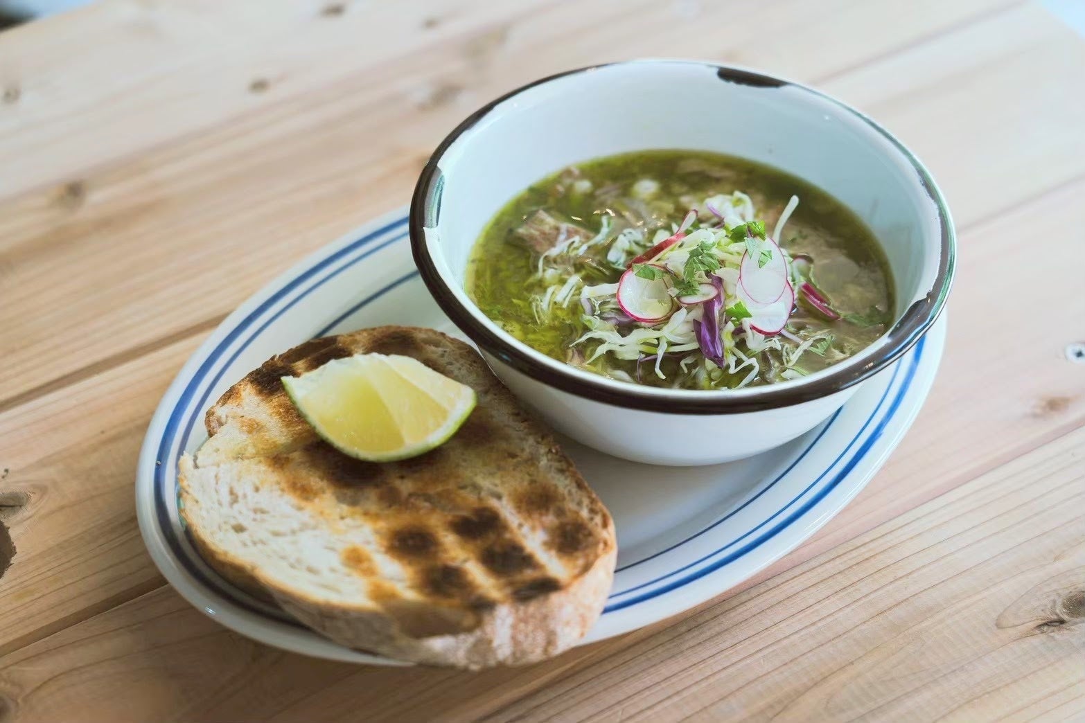 カリフォルニアの食文化に欠かせないメキシコ料理。オーナー自身も西海岸でよく食べていた大好きな味を、Pebble流に仕上げた “心と体を温めるグリーンスープ” です。