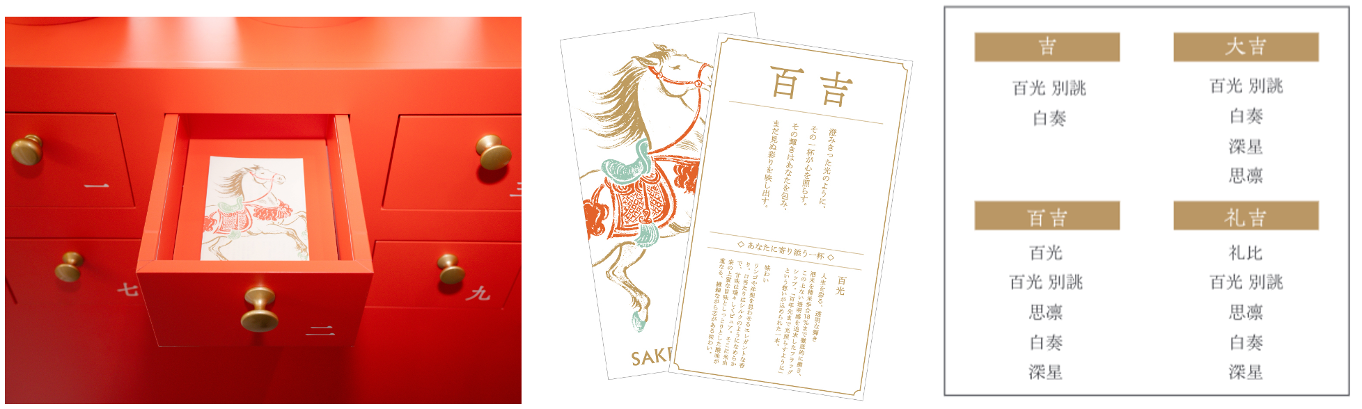 「百光 “おみくじ” STAND」のメインコンテンツは、おみくじの運勢に応じて希少な日本酒をテイスティングできる「おみくじテイスティング」。