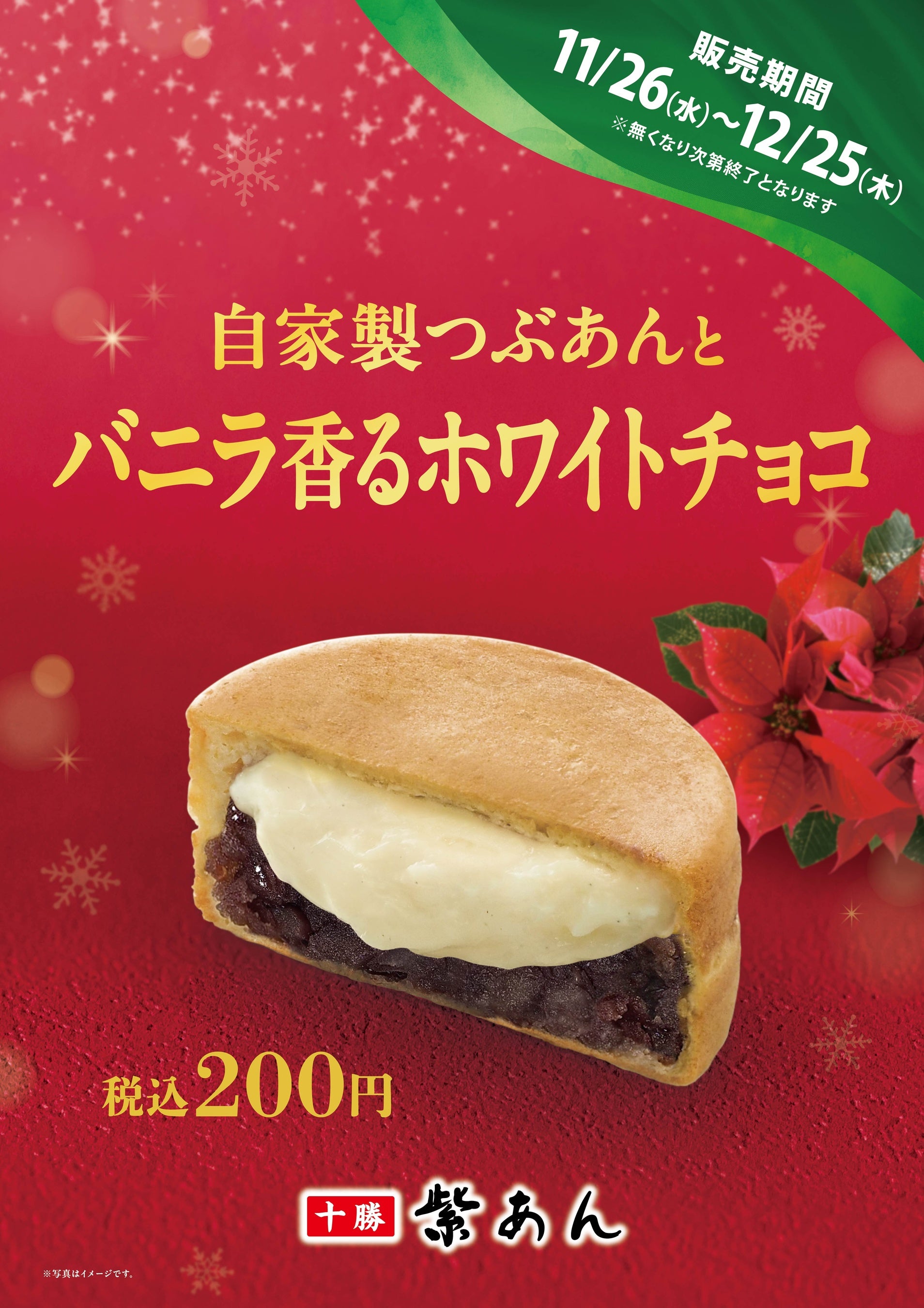 この度、『紫あん』では、クリスマスシーズンに合わせて、ホワイトチョコと自家製つぶあんを組み合わせた大判焼を期間限定で販売いたします。店内で炊き上げた自家製つぶあんは、甘さ控えめで小豆本来の旨味が引き立つ優しい味わい。そこにバニラの香りがふわっと広がるホワイトチョコが重なり、口の中でとけ合う贅沢な美味しさをお楽しみいただけます。大判焼は、熱伝導のよい専用の銅板でひとつひとつ丁寧に、外は香ばしく中はふんわりと焼き上げており、おやつにはもちろん、親しい方への手土産にも喜ばれる、期間限定の一品となっております。