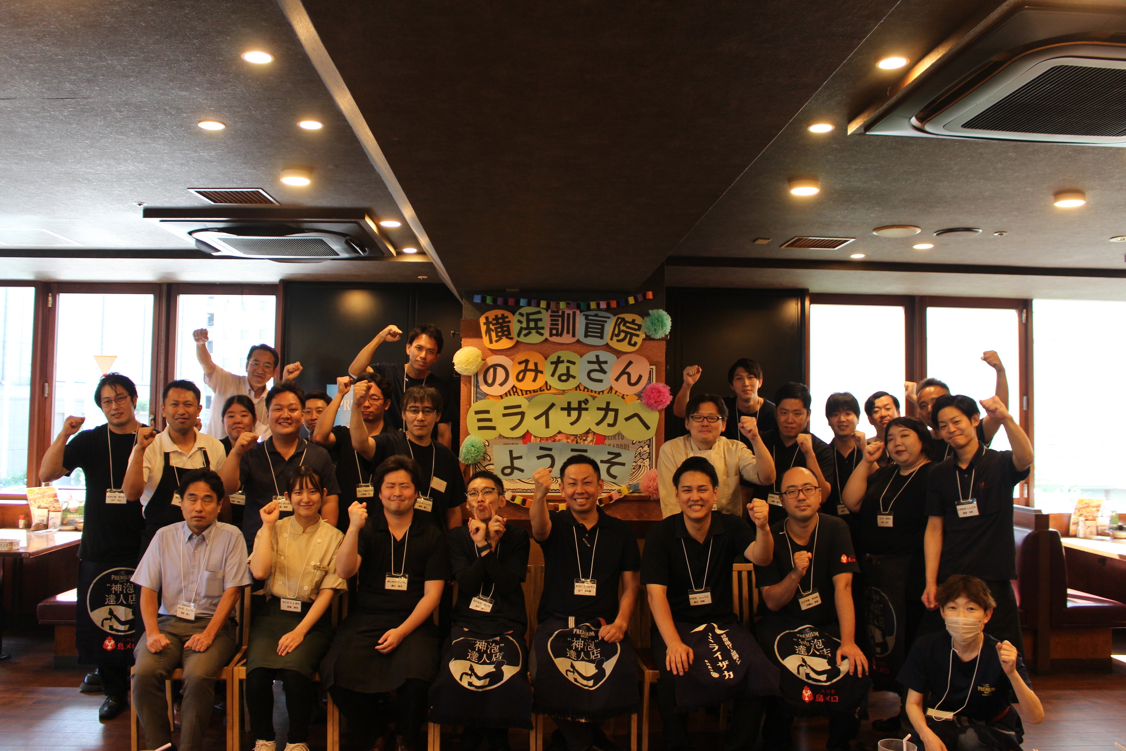 ミライザカ横浜駅前店にて横浜訓盲学院の小学生~高校生の子どもたち約20名をご招待しお食事会を開催し、居酒屋でのお食事を楽しんでいただきました。参加した従業員は店内の飾りつけから食器の準備、料理のオーダー作成・提供を行い、また子どもたちとの会話やビンゴ大会を通しホスピタリティを学ぶ1日となりました。