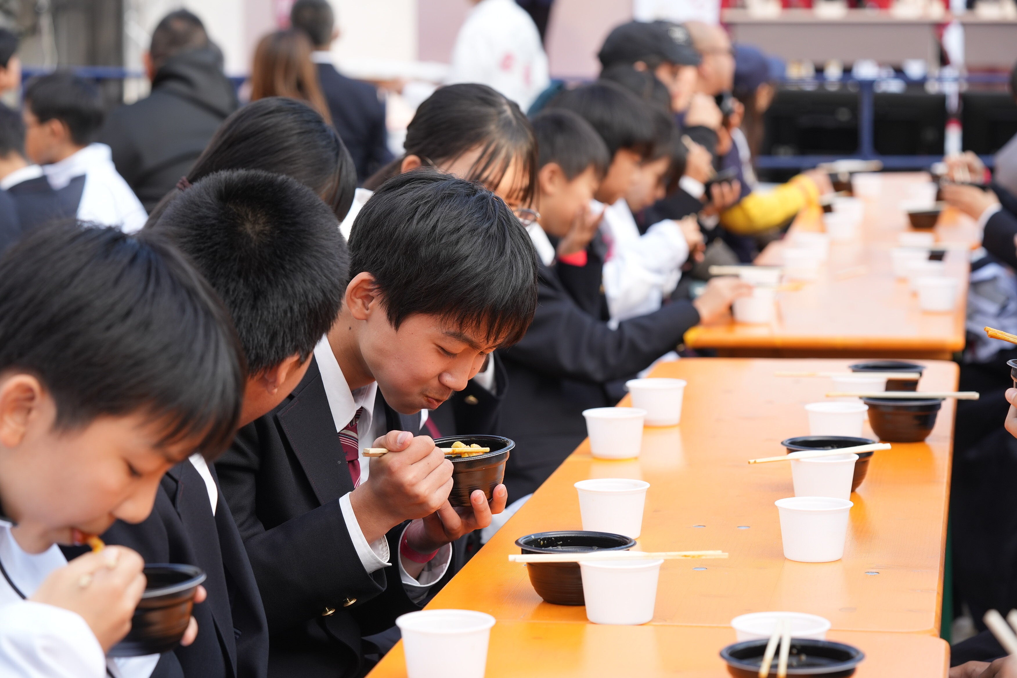 開会式の熱狂が冷め止まぬまま、午後2時半より3種類以上の異なる「うどんメニュー」をテイスティングした人数に基づくギネス世界記録™への挑戦がスタート。丸亀製麺の『ぶっかけうどん』『甘口トマたまカレーうどん』、日本うどん協会による『醤油うどん』を合わせた3種の“打ち立て”の試食に、丸亀市内にある大手前丸亀中学校と藤井中学校の生徒、その他丸亀市の職員や市民など総勢315名が挑戦しました。