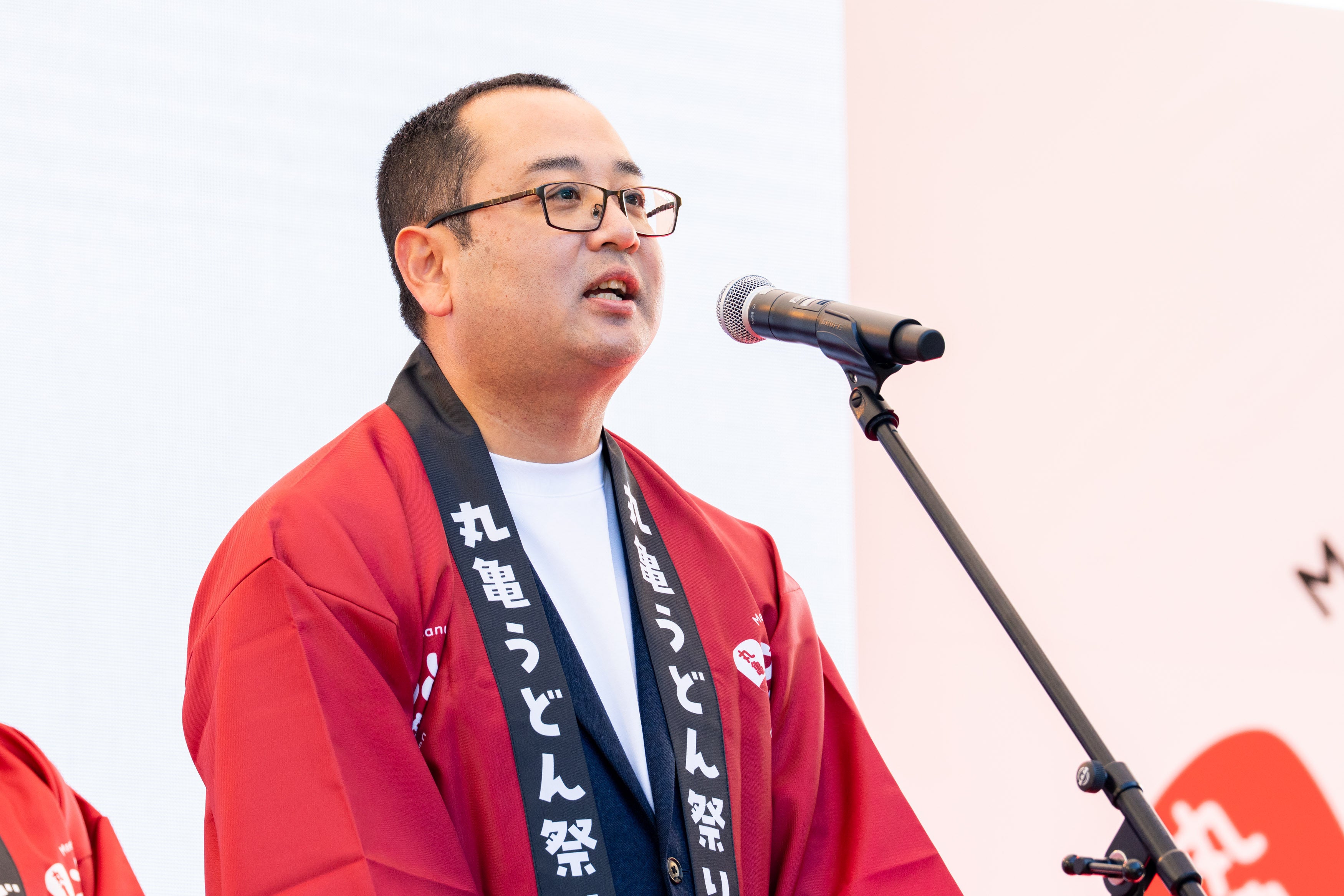 そして、開催にご協力頂いた7団体の皆さまからのご挨拶や「丸亀うどん祭り2025」2日間のイベント内容についてご紹介の後、開幕セレモニーを実施。丸亀製麺 ブランドアンバサダーの上戸 彩さんによる「丸亀うどん祭り2025 開幕です!」という宣言のもと、“うどん”くす玉が弾けました。