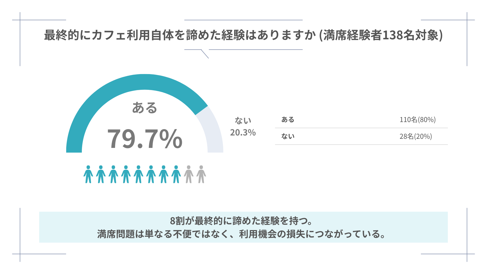 さらに、満席経験者の80%(110名)が「満席に遭遇した際、最終的にカフェ利用自体を諦めた経験がある」と回答しました。これは満席問題は単なる不便ではなく、利用機会の完全な損失につながっています。