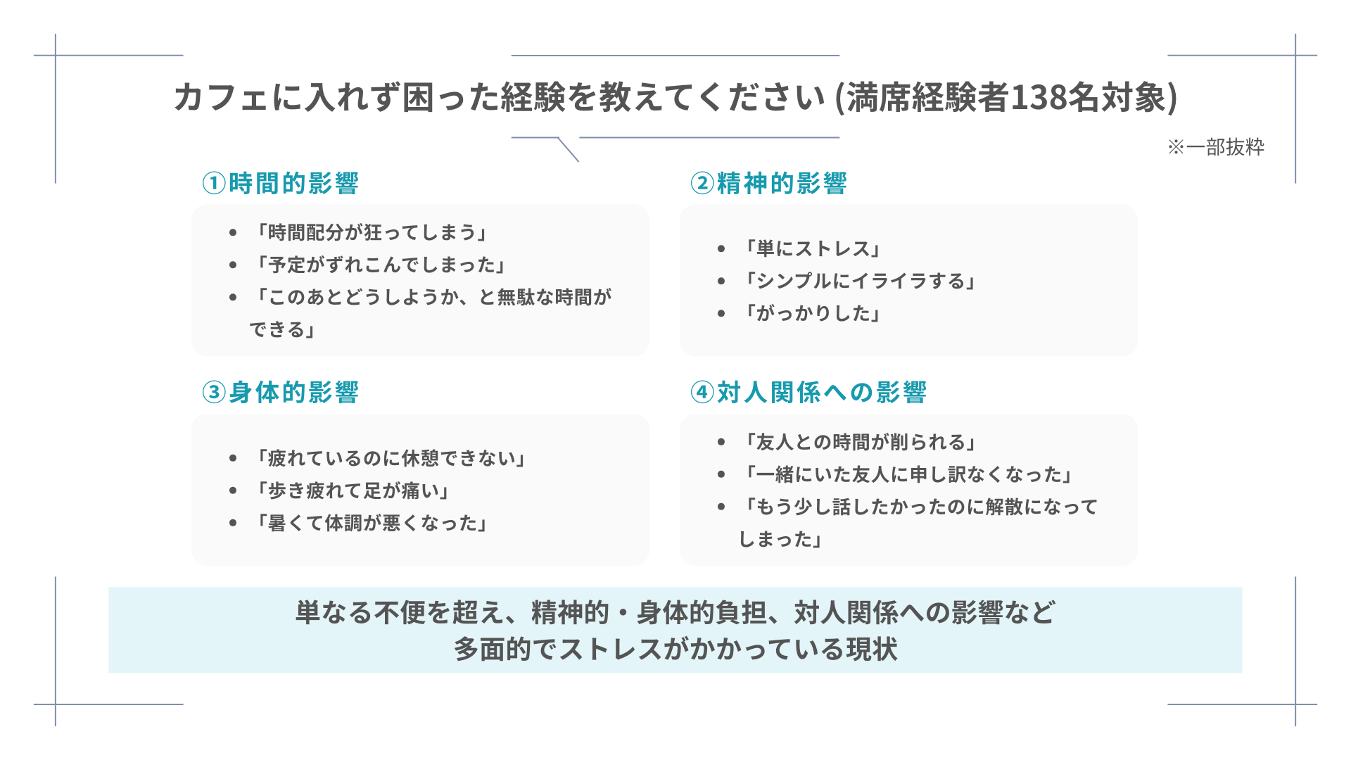 「カフェに入れなかった場合に困ったこと」の自由回答からは、以下のような深刻な影響が浮き彫りになりました