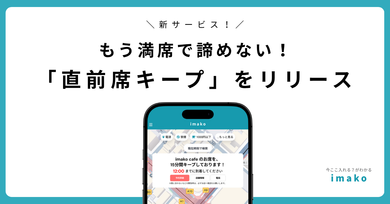 「直前席キープ」は、imakoアプリからお店を選び、簡単な操作でリクエストを送ることで、お店に15分間、席を確保してもらえる新サービスです。「今から行きたい」と思ったその時に、満席を心配することなく、安心してカフェに向かうことができます。