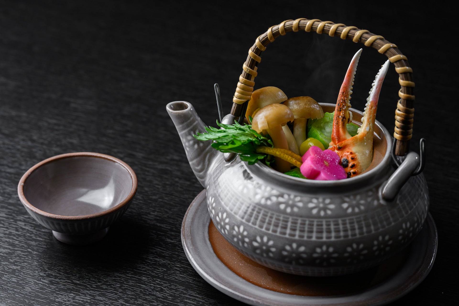 続いて、香ばしく焼いたズワイ蟹と白菜や春菊などの冬野菜の旨味が凝縮された「土瓶蒸し」、自家製のクリームを高級湯葉で包み香ばしく揚げた「蟹クリームコロッケ東寺揚げ」、そしておこげご飯に熱々の蟹餡をかけた「蟹餡がけおこげ」など、食感や温度差も楽しめる構成となっており、最後までズワイ蟹の魅力を余すところなくご堪能いただけます。