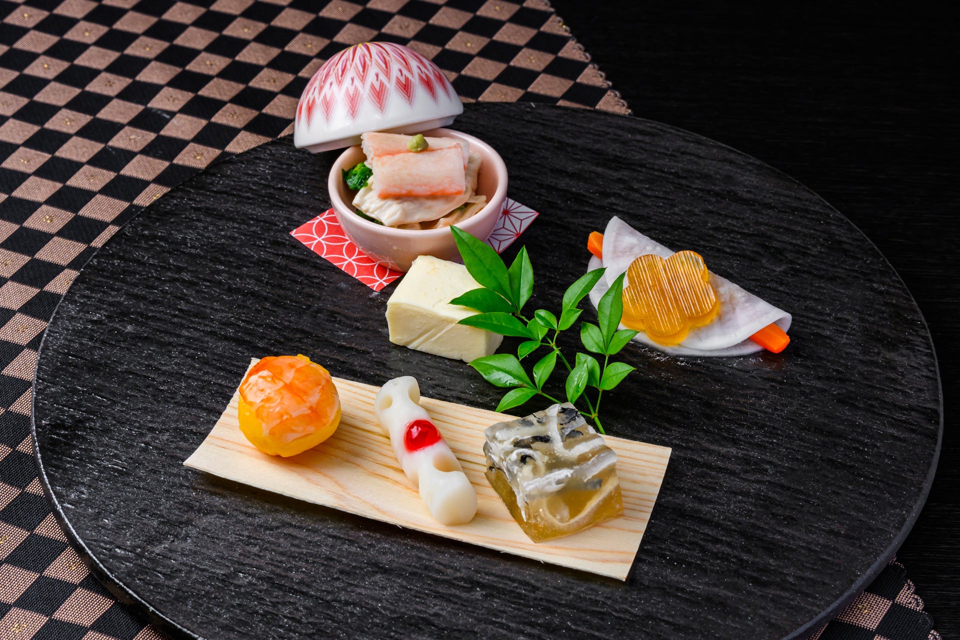 コースは、新春にふさわしい華やかな「季節の前菜七種盛り」から始まります。貴重な湯葉に蟹身を添えた小鉢、へしこかぶらの花びら餅仕立て、爽やかな甘酸っぱさの梅の花一葉、ふぐの煮凝り、クリームチーズの西京漬け、彩り豊かな海老の黄身寿司、そして梅肉で爽やかに仕上げた加賀蓮根甘酢漬けと、多彩な味わいと食感が楽しめる上品な一皿です。