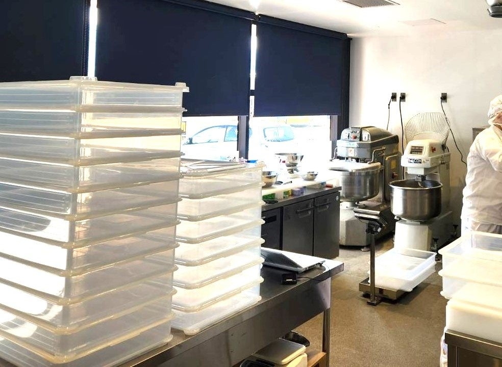 R Bakerは、『心とからだにおいしいパンを』という想いのもと、オリジナル製法でブレンドした国産米粉をメインに使用し、もっちり、しっとりとした食感が特徴で、お客様に好評いただいております。山梨県にあるセントラルキッチンで、熟練職人が技術と手間をかけ製造した冷凍生地を店舗へ配送しています。特に時間のかかるクロワッサンや生地作りをセントラルキッチンで行い、店頭では焼き上げるだけなど、簡略した製造工程を実現できる状態で届きます。