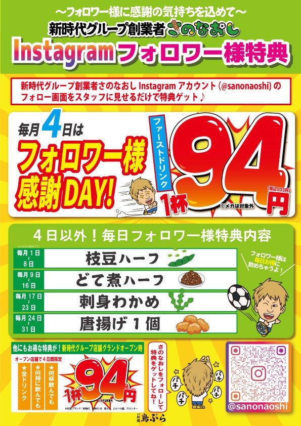 このキャンペーンでは、新時代グループ創業者さのなおしの公式Instagramアカウント(@sanonaoshi)を応援(フォロー)していただいているお客様全員に毎日特典をプレゼントいたします。