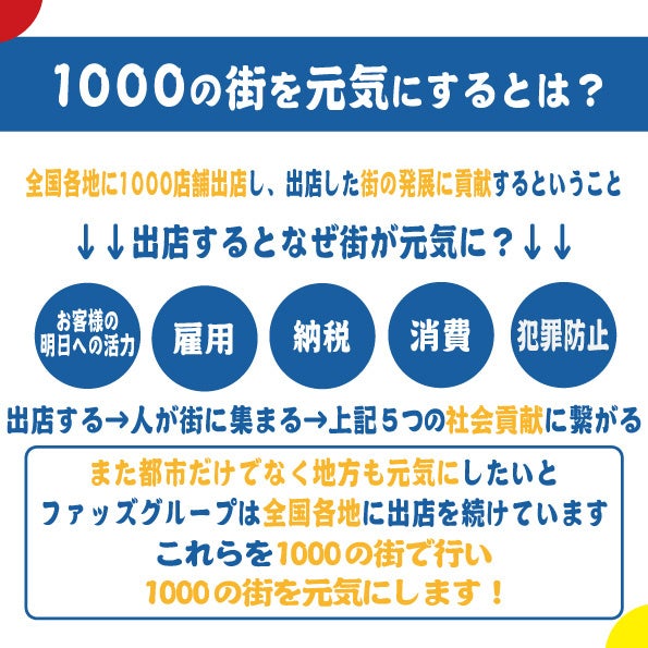 私たちは「1000の街を元気にする」ことを目指し、グループ全体で上は北海道、下は沖縄と全国各地に現在約200店舗=200の街を元気にしてきました。お店を作ることで社会貢献を行っており、具体的には①お客様の明日への活力②雇用③消費④犯罪防止⑤納税があります。