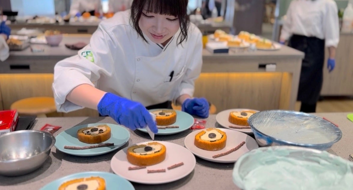 採用作品を開発したのは、カフェ総合マネジメントコース3年生の松鼻百華さん。現地視察では、来館者が足を止めて笑顔になるナマケモノの姿が印象に残り、人気キャラクター”ノロロ”(ナマケモノ)をモチーフに「展示の余韻をスイーツで表現したい」という発想が生まれました。