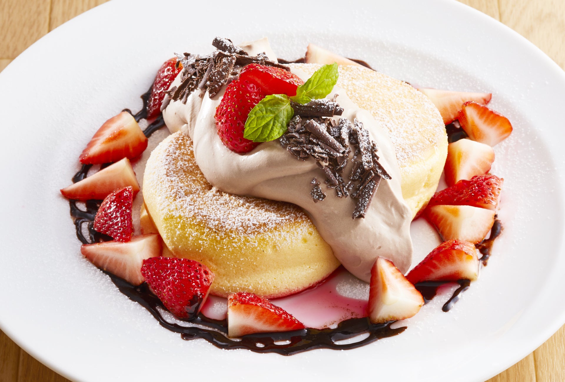 ふんだんに使用した博多あまおう苺とふわふわパンケーキに、滑らかなチョコホイップをトッピング。この時期限定のパンケーキです。