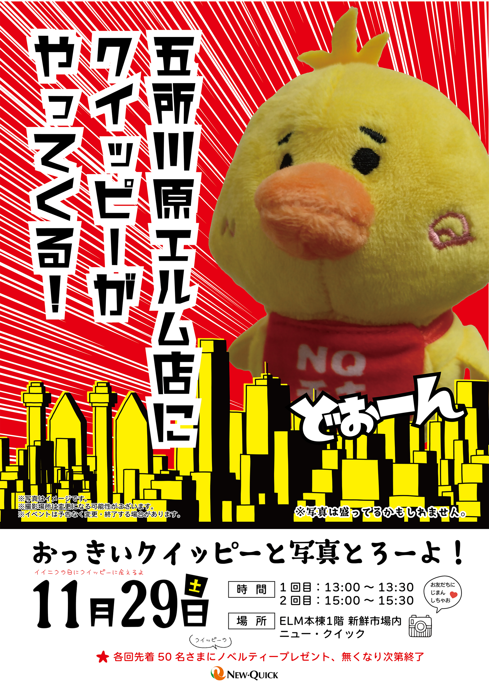 さらに、ニュー・クイック五所川原ELM店では特別企画として、当社公式キャラクター「クイッピー」が青森に初上陸。じゃんけん大会や撮影会など、ご家族で楽しめるミニイベントを開催いたします。