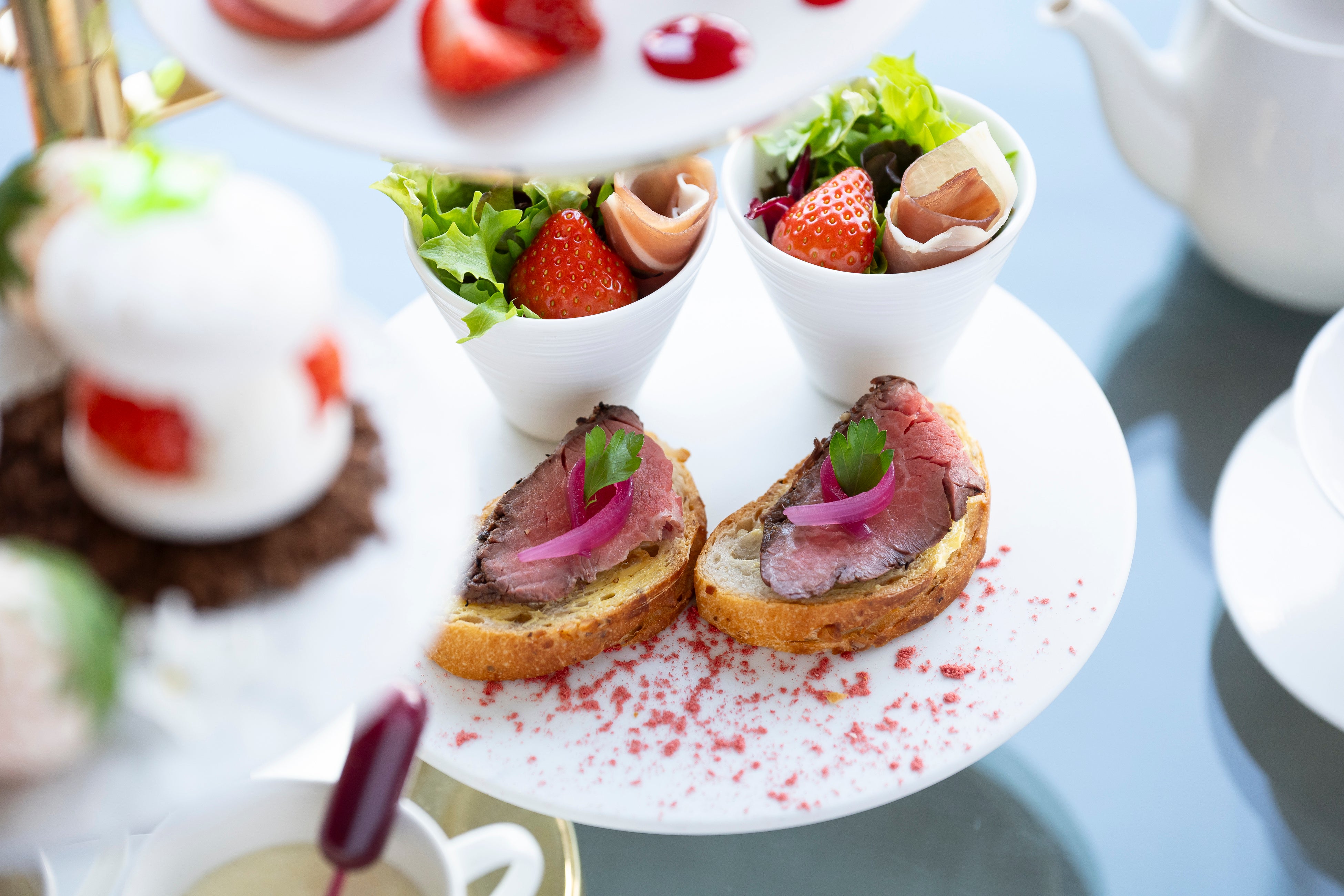 セイボリーには、野に咲くいちごをイメージした「いちご畑コーン」や、香ばしく焼き上げたクルミパンにローストビーフを重ね、レッドオニオンのピクルスをアクセントに添えた「ローストビーフオープンサンド」をラインナップ。