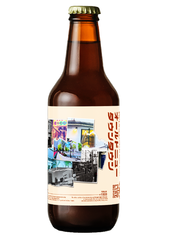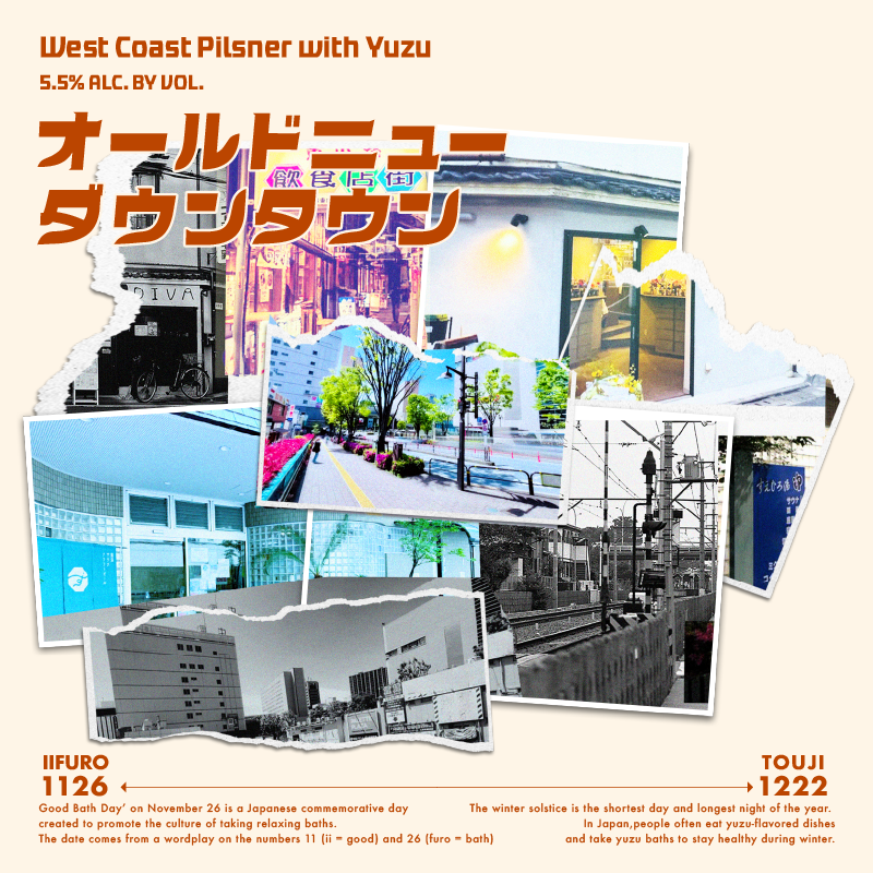 「温故知新」をテーマに、舞台となった大井町の過去と現代の写真を一枚に混ぜ込んでアートワークを作成しました。今回の企画の肝となる”いい風呂の日”と”冬至”の期間から、2026年がこのビールに関わるみなさんにとって良い年となるようなデザインに仕上げました。レトロ感は意識しつつも現代風にまとめ上げています。