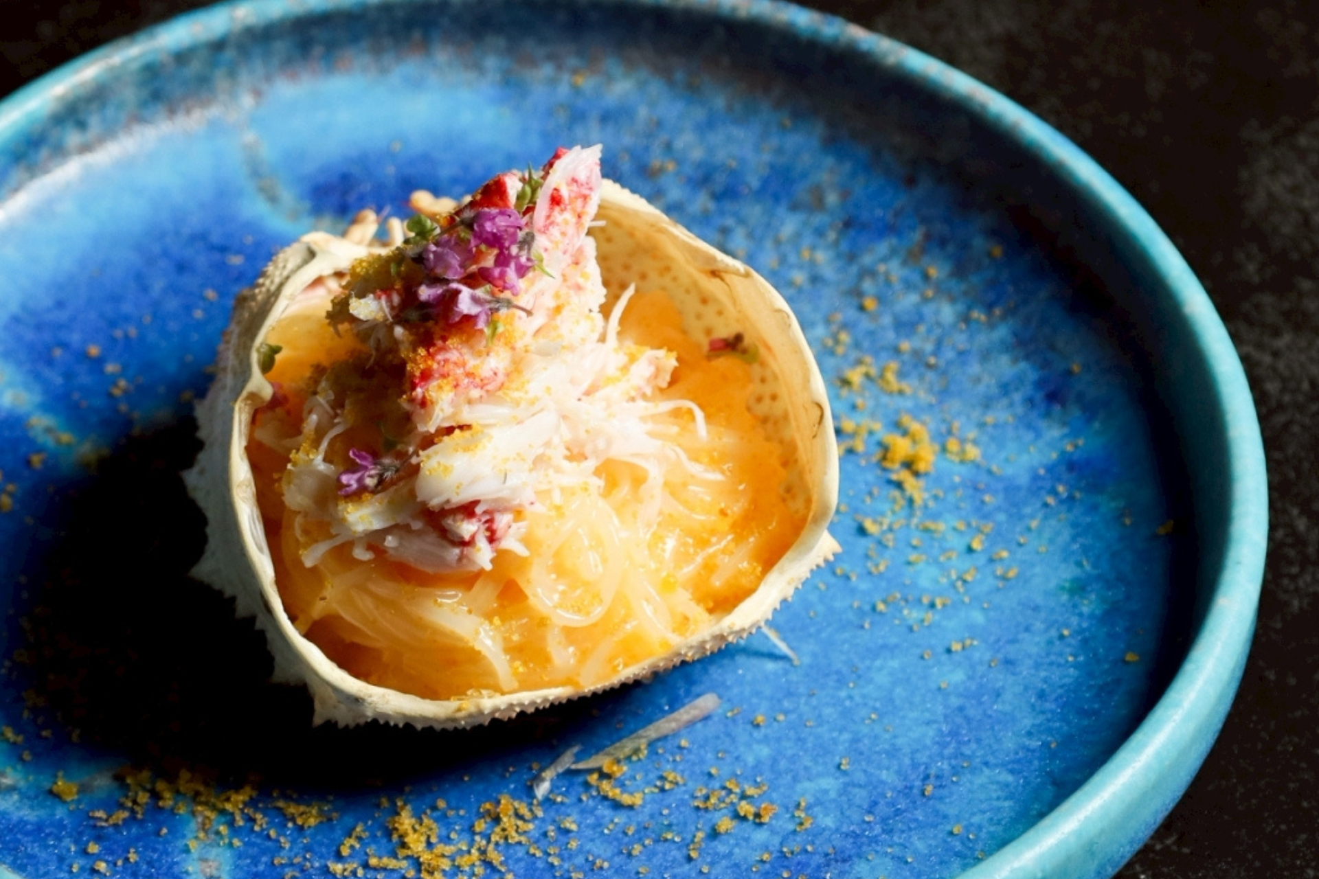 毛ガニの甘みと濃厚なカニみそを春雨に絡め、仕上げにカラスミの塩味とうま味を重ねた、冬ならではの贅沢なひと皿です。