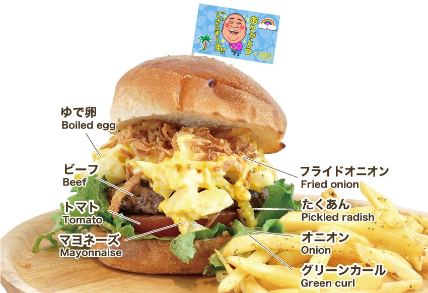 「けいちょん」こと極楽とんぼの山本圭壱さんプロデュースによるコラボ「ザ・スマッシュドエッグバーガー」は、たくあんをアクセントに効かせた自家製エッグサラダと、ジューシーに焼き上げた100%ビーフのパティの贅沢なハーモニーが楽しめる一品。