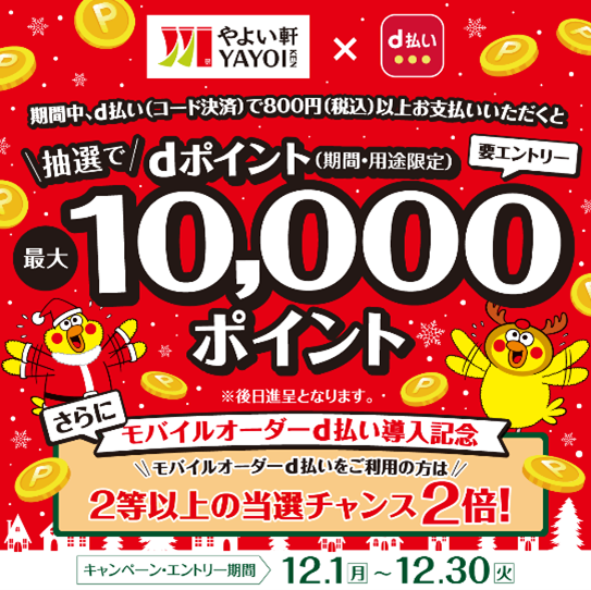 期間中、dポイント専用ページよりエントリーの上、「やよい軒」で合計800円以上(税込)のd払い(コード決済)ご利用で、最大10,000ポイントがあたる。