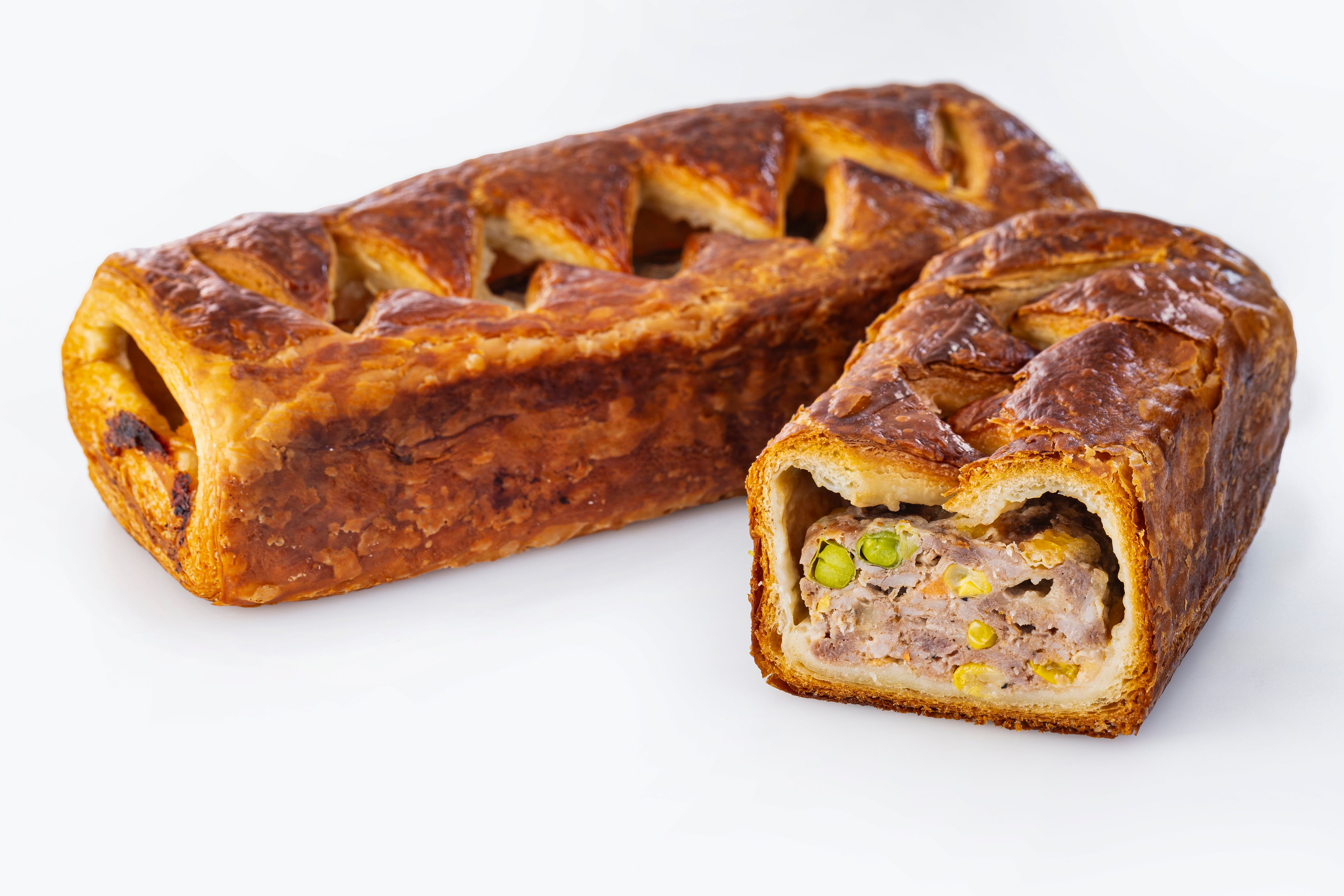 クロワッサン生地で、国産合い挽き肉と3 種の野菜を 包み込んだ食べ応え 満点のミートローフデニッシュ。ホテルメイドならではの香ばしい生地とスパイスの効いたジューシーな旨みが 楽しめる、ホームパーティーにも最適な一品 です 。