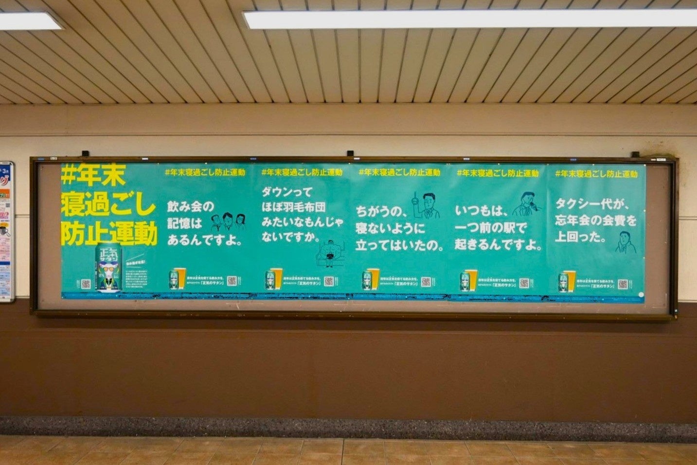 忘年会シーズンの12月は、一年の中でも飲み会の頻度が最も高い月*です。お酒を飲みすぎてしまった結果、帰宅途中の電車内でつい寝過ごし、最寄りから離れた終着駅まで行ってしまうという苦い思いをしないよう、「年末寝過ごし防止運動」を実施します。終着駅9駅へ交通広告を掲出し、アルコール度数0.7%の微アル飲料「正気のサタン」を選択肢に取り入れることで適度な飲酒機会を保つことを提案します。また、都内の一部飲食店でも適正飲酒を促すポスターを掲示し、「正気のサタン」を提供します。