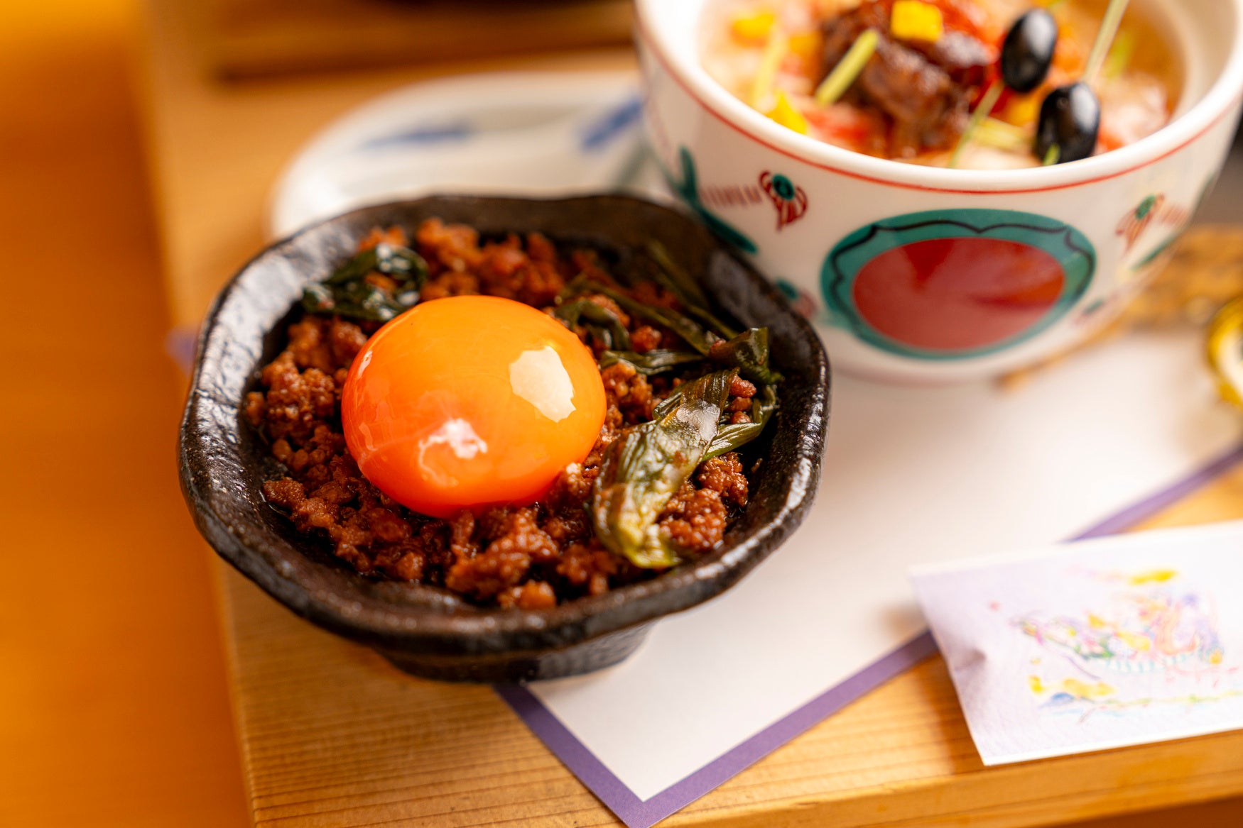 ふっくらと炊き上げた鴨そぼろに炭燻の香りをまとわせ、九条葱の甘みと濃厚な卵黄のまろやかさを添えた、香ばしい釜飯です。