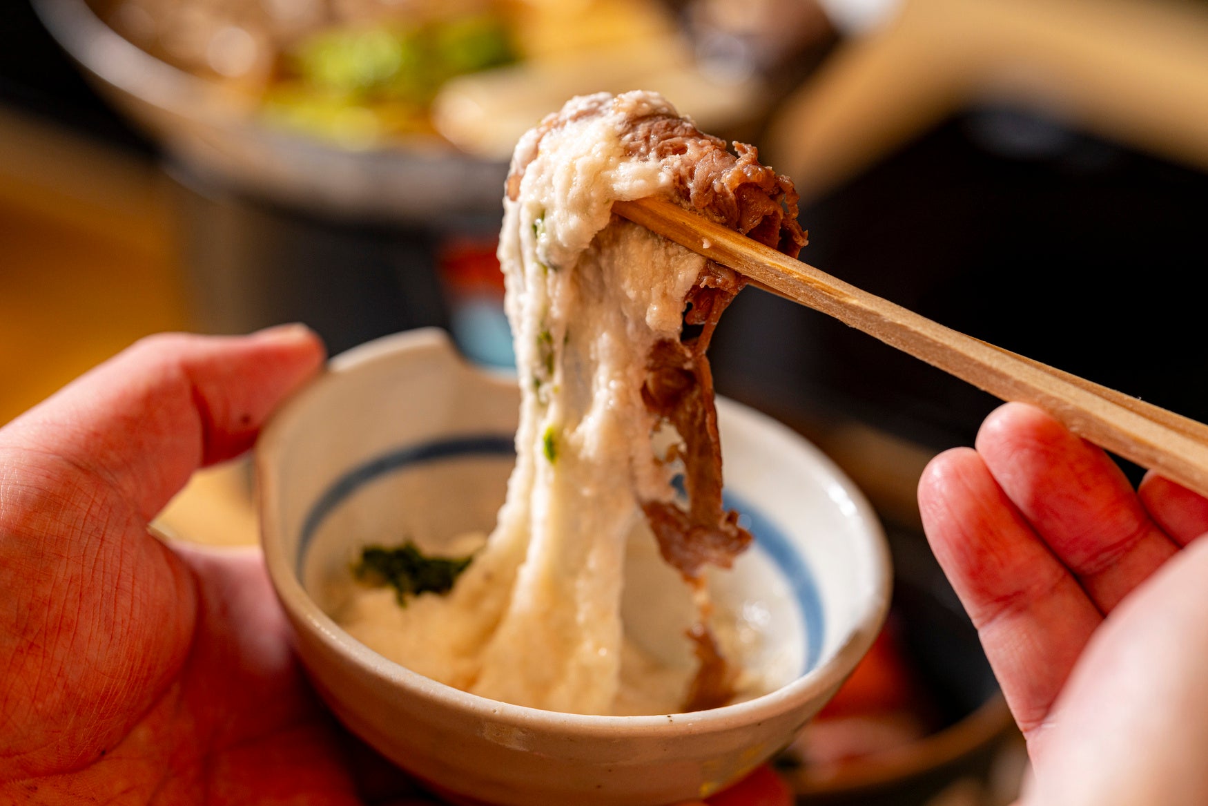 すき焼きで煮上げた和牛を、なめらかなとろろにくぐらせていただく食べ方です。