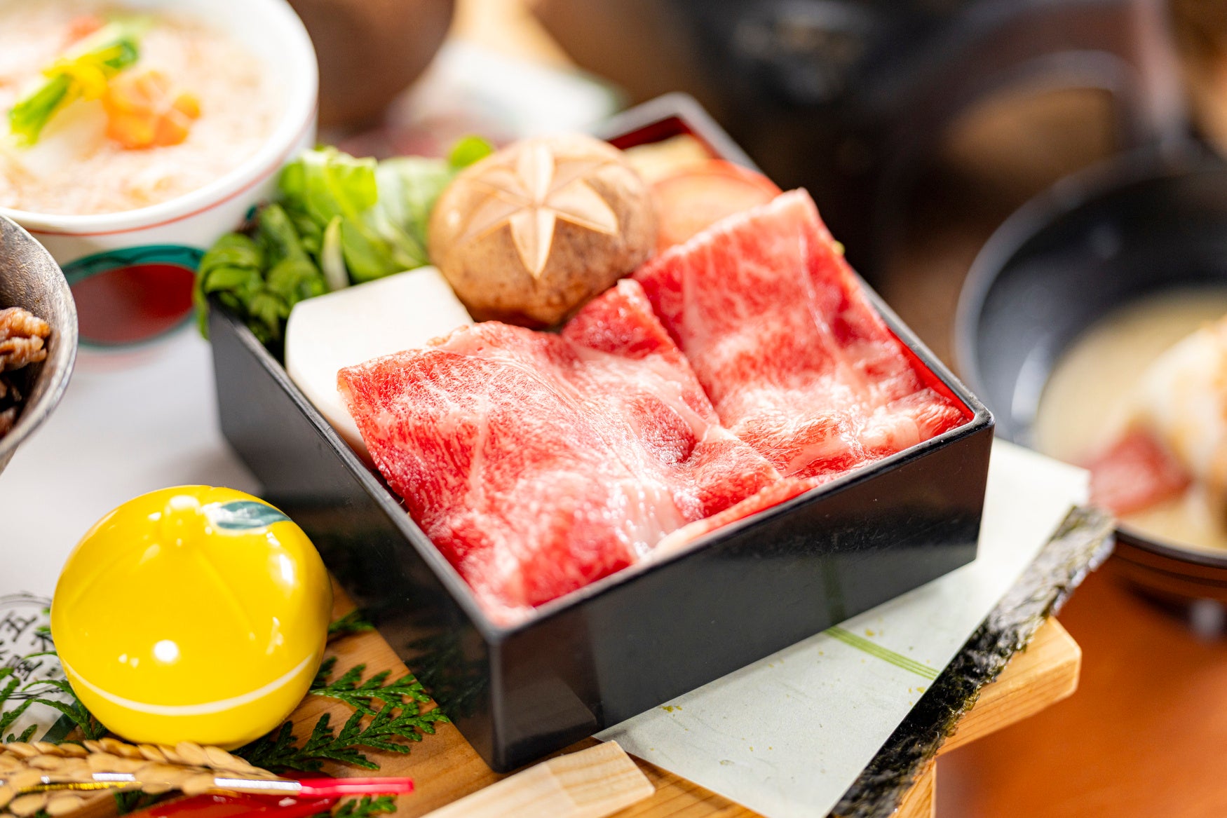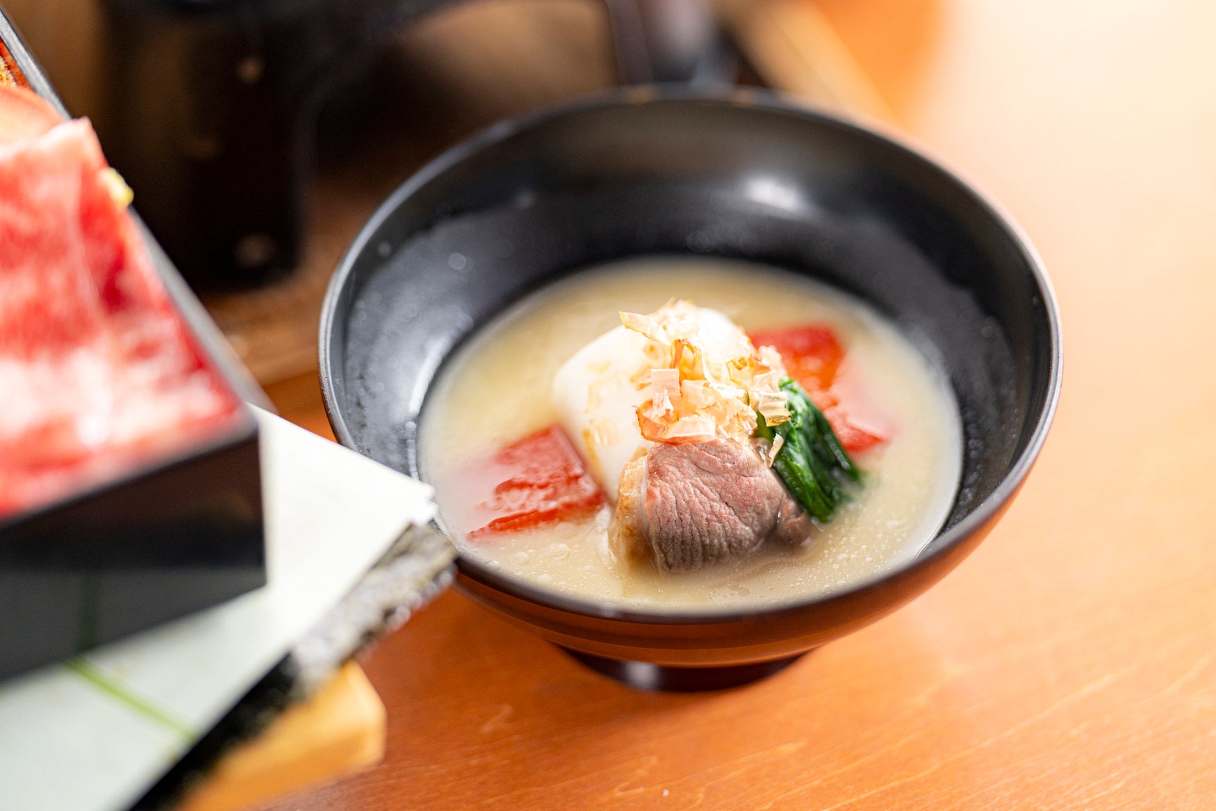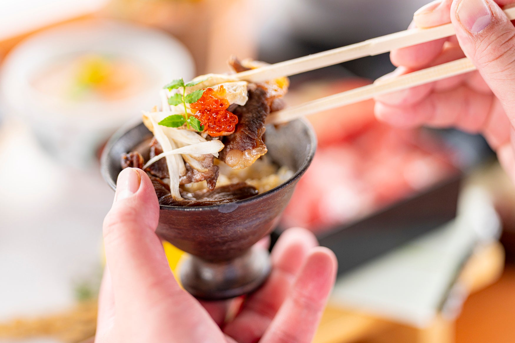 旨み豊かな和牛を甘辛の割下でやわらかく煮含め、生湯葉といくらを合わせたすき焼き仕立て。