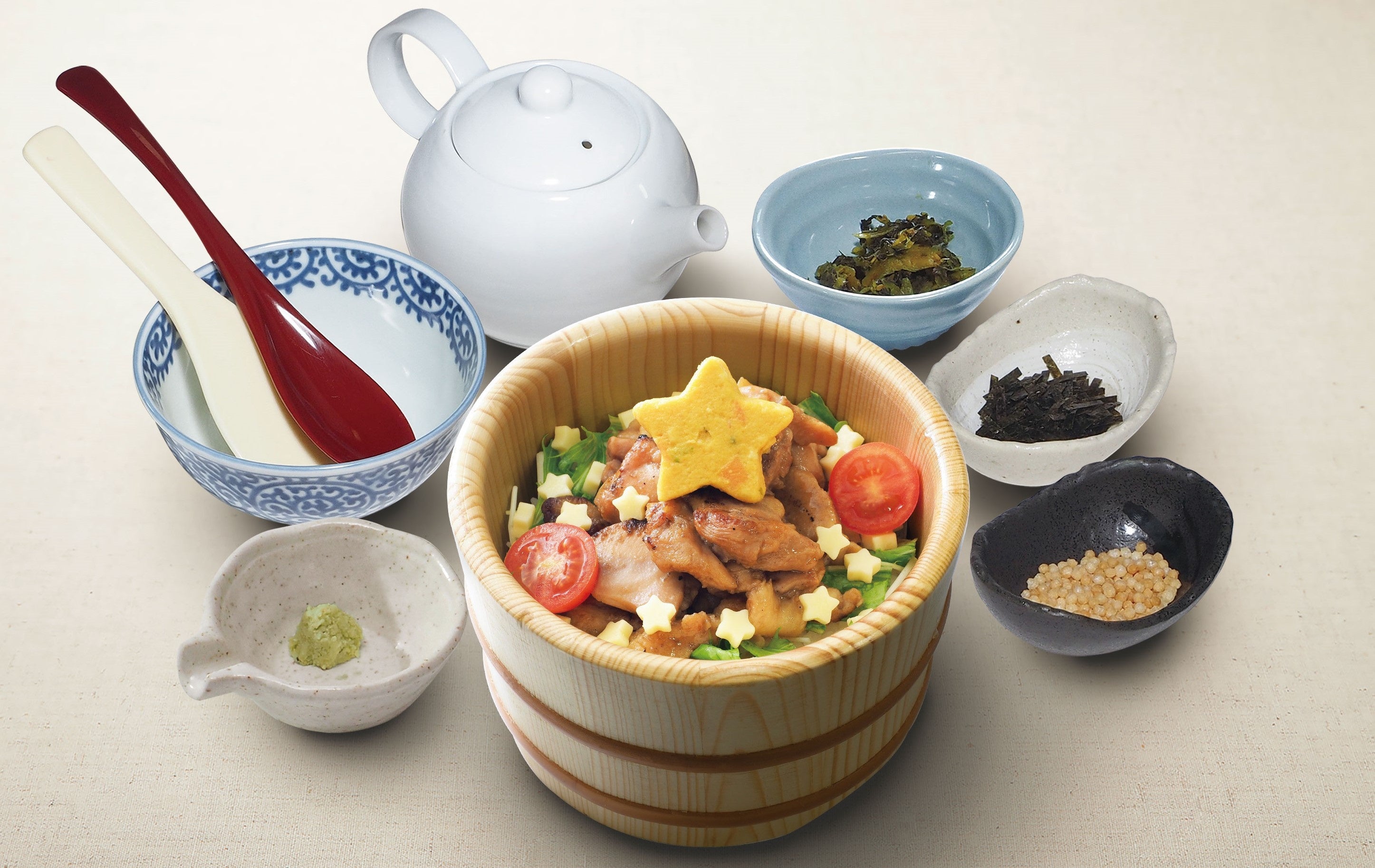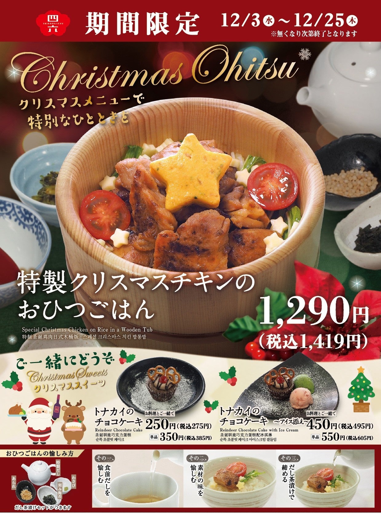 当社では、年間イベントを取り入れた商品開発を行い、その時期ならではのご要望にお応えするメニューをご提案しております。このたび、『おひつごはん四六時中』では、クリスマスシーズンにお客さまへ特別なひとときをお届けしたく、期間限定のおひつごはんとスイーツをご用意いたしました。「特製クリスマスチキンのおひつごはん」は、クリスマスツリーをイメージし、炭火で焼き上げた香ばしいチキンの上に大きな星形の真薯(しんじょ)をトッピングし、さらに小さな星型のチーズを散りばめた見た目も楽しめる一品です。