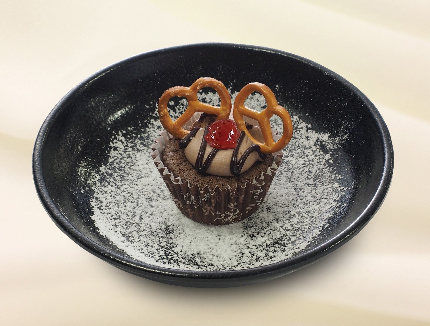 チョコカップケーキにプレッツェルとストロベリーソースをデコレーションし、トナカイに見立てた遊び心あふれるスイーツ!