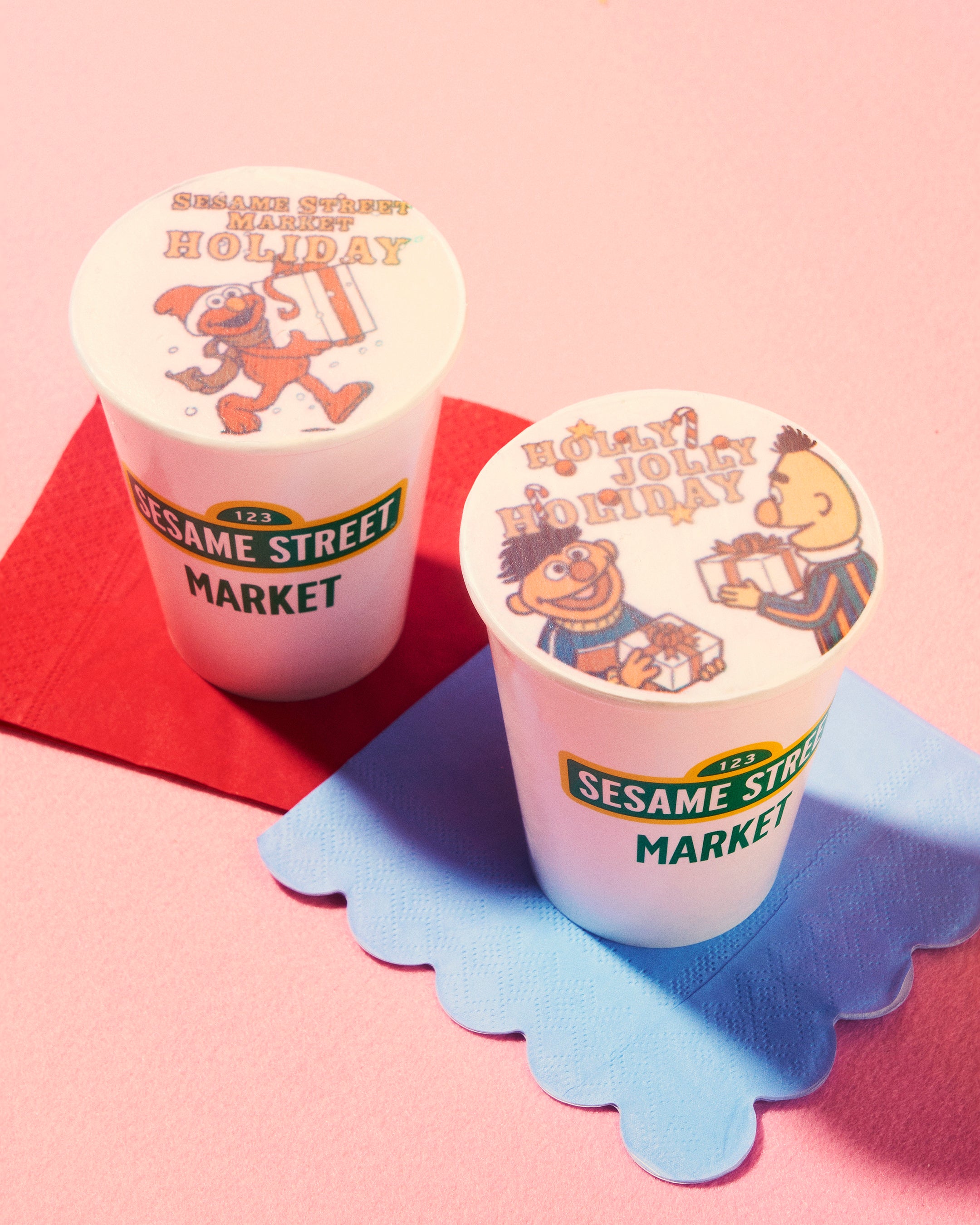 ホリデーカフェメニュー第1弾で大変ご好評いただいている、ホリデー限定デザインのキャラクターラテ。サンタ帽をかぶったエルモが元気いっぱいにプレゼントを抱える様子と、クリスマスプレゼントを贈り合うアーニー&バートを描いた、見た目にもほっこり癒される2種類のデザインをラインアップしており、お好みに合わせてお好きなデザインをお選びいただけます。アイス・ホットともにご用意しております。