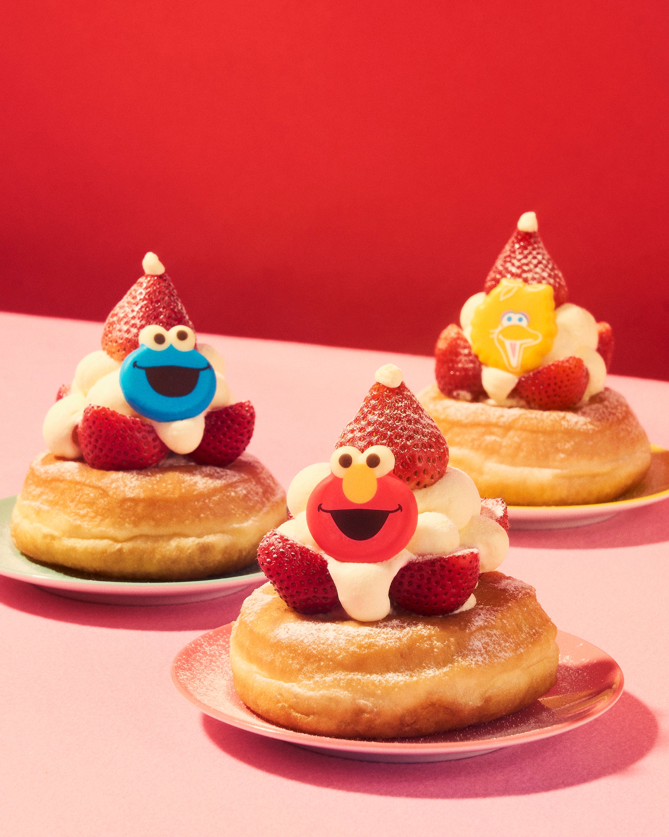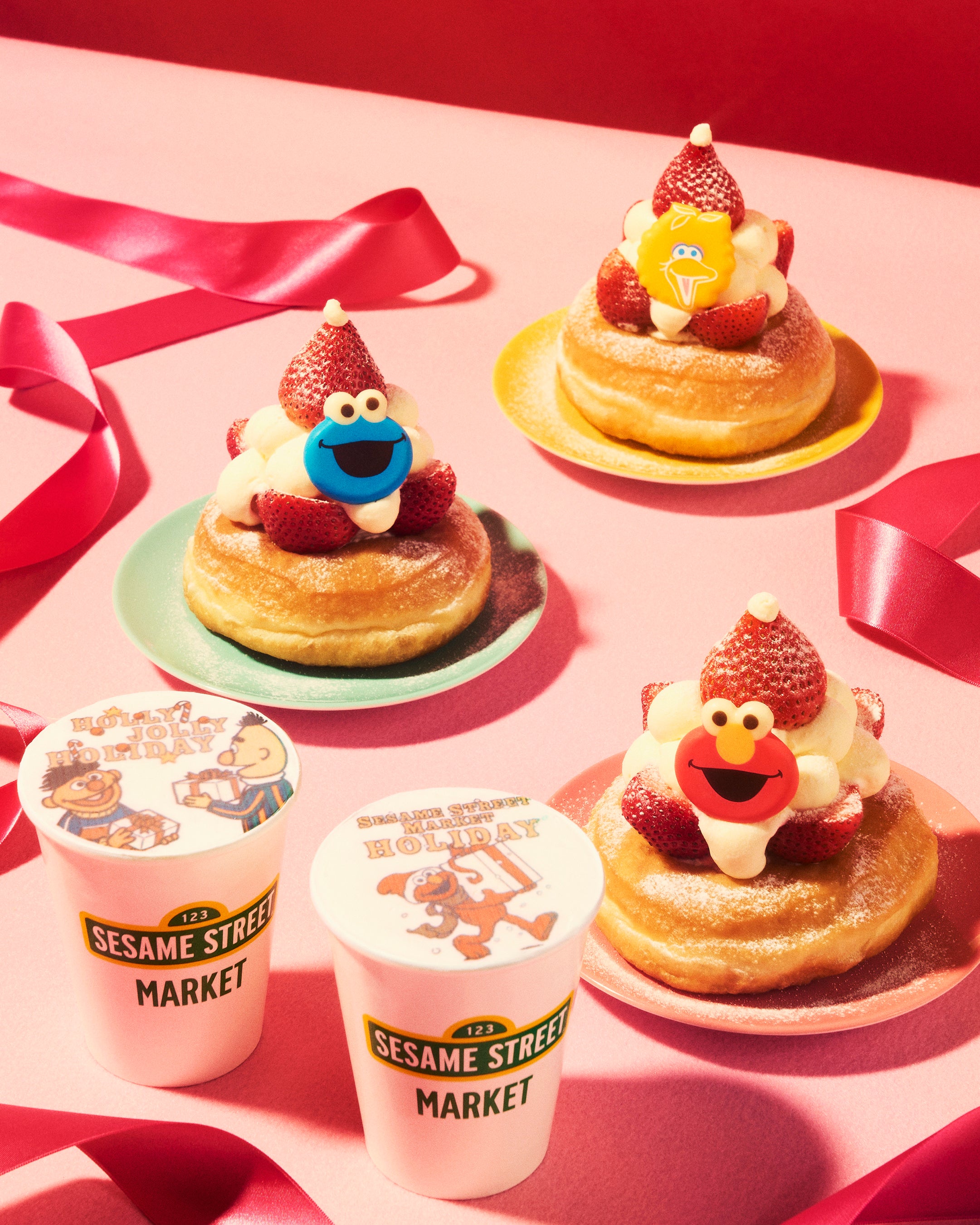 「メリードーナツ」は、いちごでできたサンタ帽をかぶってサンタになりきったエルモ、クッキーモンスター、ビッグバードをモチーフにした、まるでクリスマスケーキのようなビジュアルに心躍るホリデードーナツ。その他、ホリデー限定デザインのキャラクターラテとともに、イートイン限定のカフェメニューとしてお召し上がりいただけます。