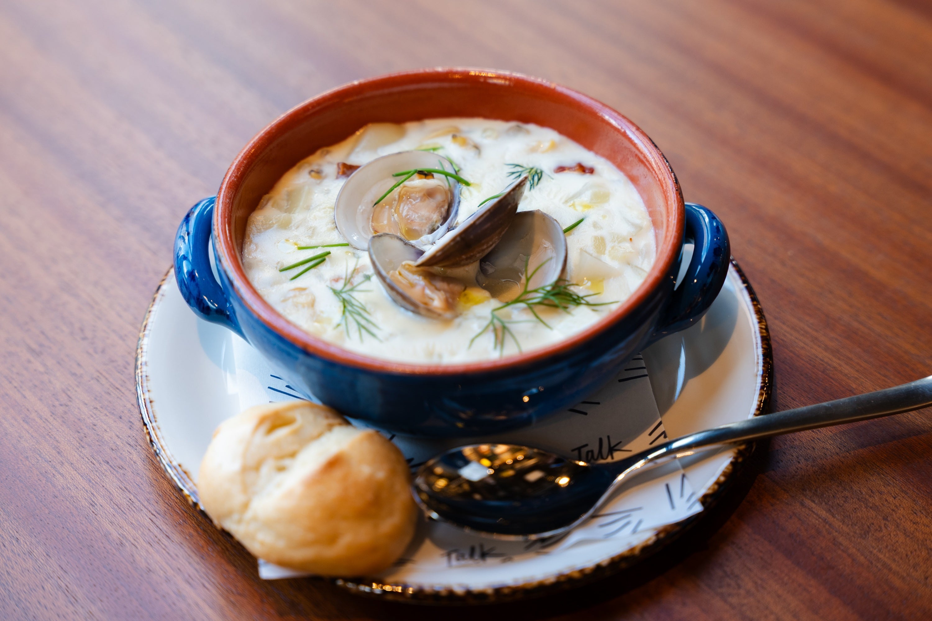 寒い季節にぴったりの、アメリカの定番スープ。クラムは香味野菜と白ワインで丁寧に旨味を引き出し、北海道クリームでまろやかでコクのある味わいに仕上げました。スモークベーコンとハーブを合わせた奥行きのあるキャプションスタイルの一皿です。