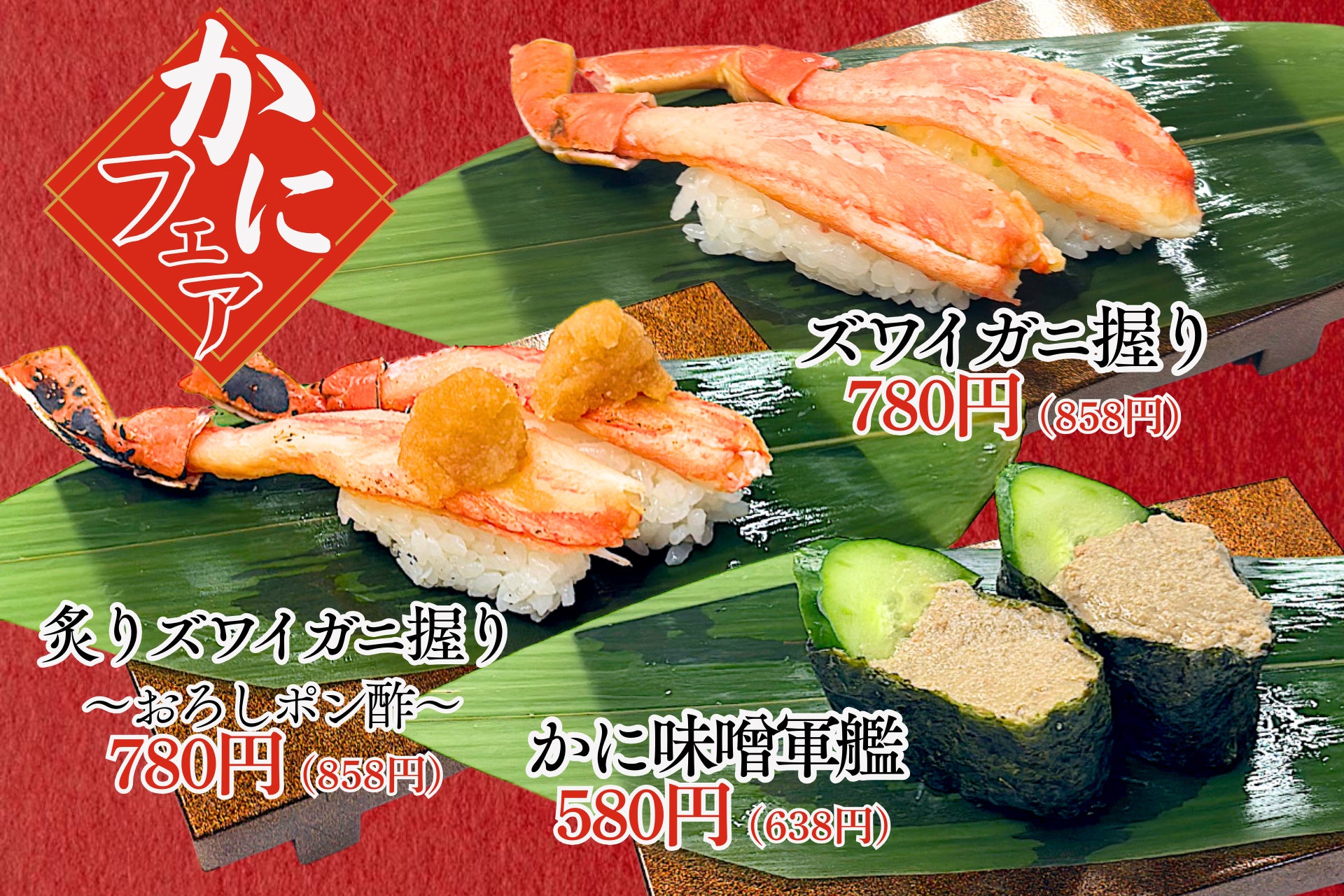 本フェアの目玉は、その大きさと食べ応えから「蟹の王様」と呼ばれる特大タラバガニです。肉厚なタラバガニの足を丸々一本豪快に使用した逸品をご提供。忘年会や特別な会食を豪華に彩ります。また、繊細な甘みが特徴の「ズワイガニ」も多彩なメニューでご用意。鮮度抜群の素材を活かし、職人が握るお寿司から、かにの旨みをシンプルに味わえるしゃぶしゃぶ、サクサクの天ぷらまで、かに尽くしのメニューを取り揃えました。